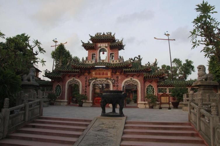 沿着小河旁的小路,我们走到了庙桥。它是会安古镇里最著名的建筑,是一座日本风格的带顶石桥,又名迎远桥,上书“远来桥”。这座桥风格古朴,桥上有匾,里面还有一个房间,放着一个雕刻精美的石雕佛像,庄严肃穆。