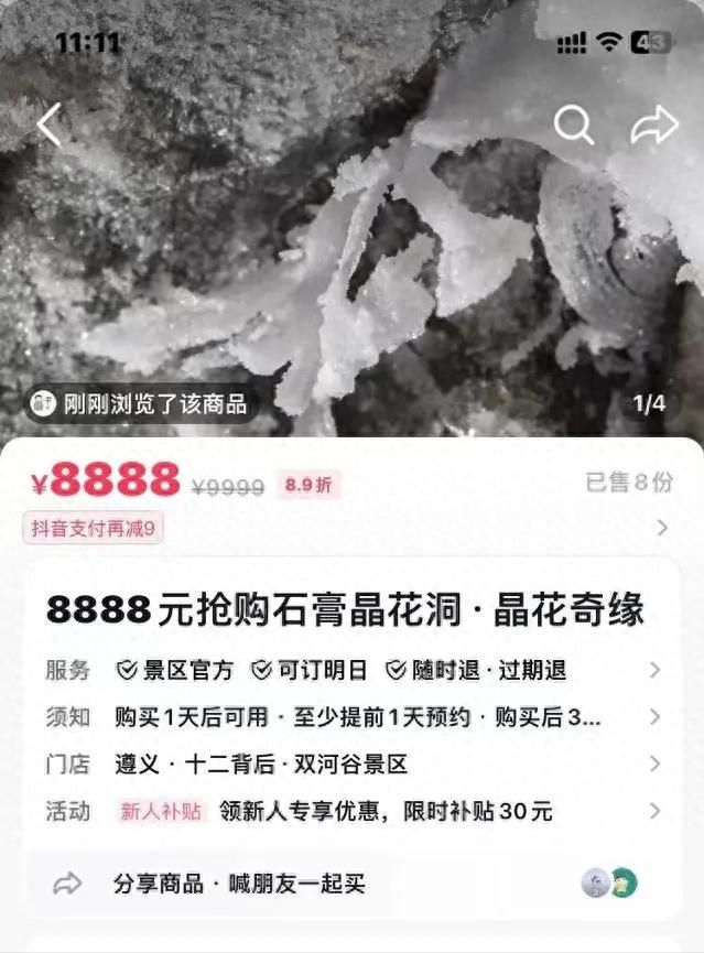 图片显示,该景点是贵州十二背后景区的石膏晶花洞,团购产品名称为“石膏晶花洞·晶花奇缘”,挂牌价9999元/份,打折后8888元/份。