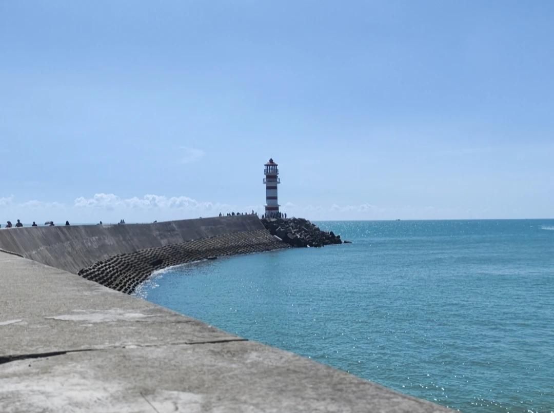 神州半岛灯塔是半岛上的地标性建筑,灯塔采用红白条纹设计,与碧海蓝天形成鲜明对比。灯塔周身圆滑,外部结构稳固,塔身配以多孔式塔灯,夜间散发出的光芒能够远距离指引船只安全航行。塔身内部,当时博主去的时候处于封闭状态,很遗憾没有看到。如果大家有机会去,可以去看一下,登上塔顶,把整个半岛的海岸线和沙滩都尽收眼底。