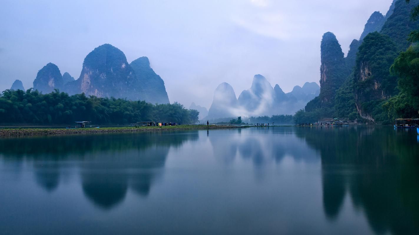 站在漓江的岸边,青山倒影在水中,似乎整个世界都沉浸在一片宁静与美丽之中。