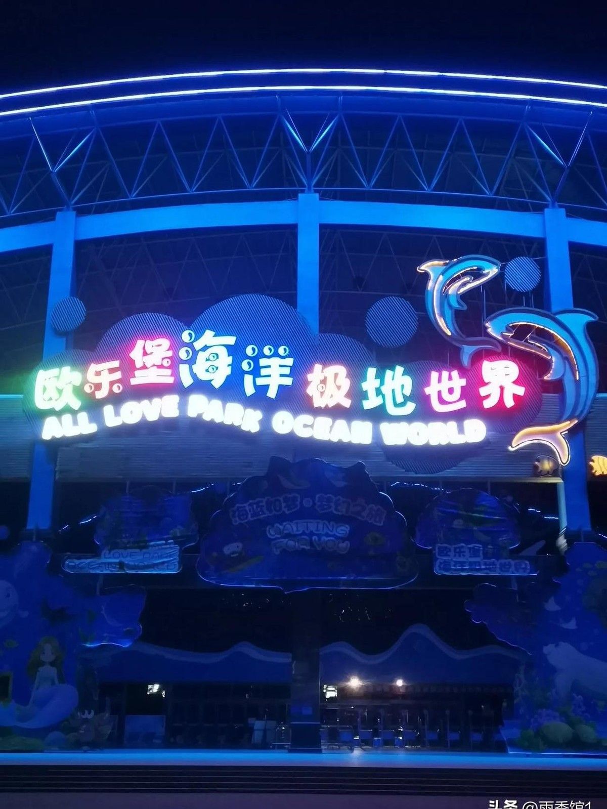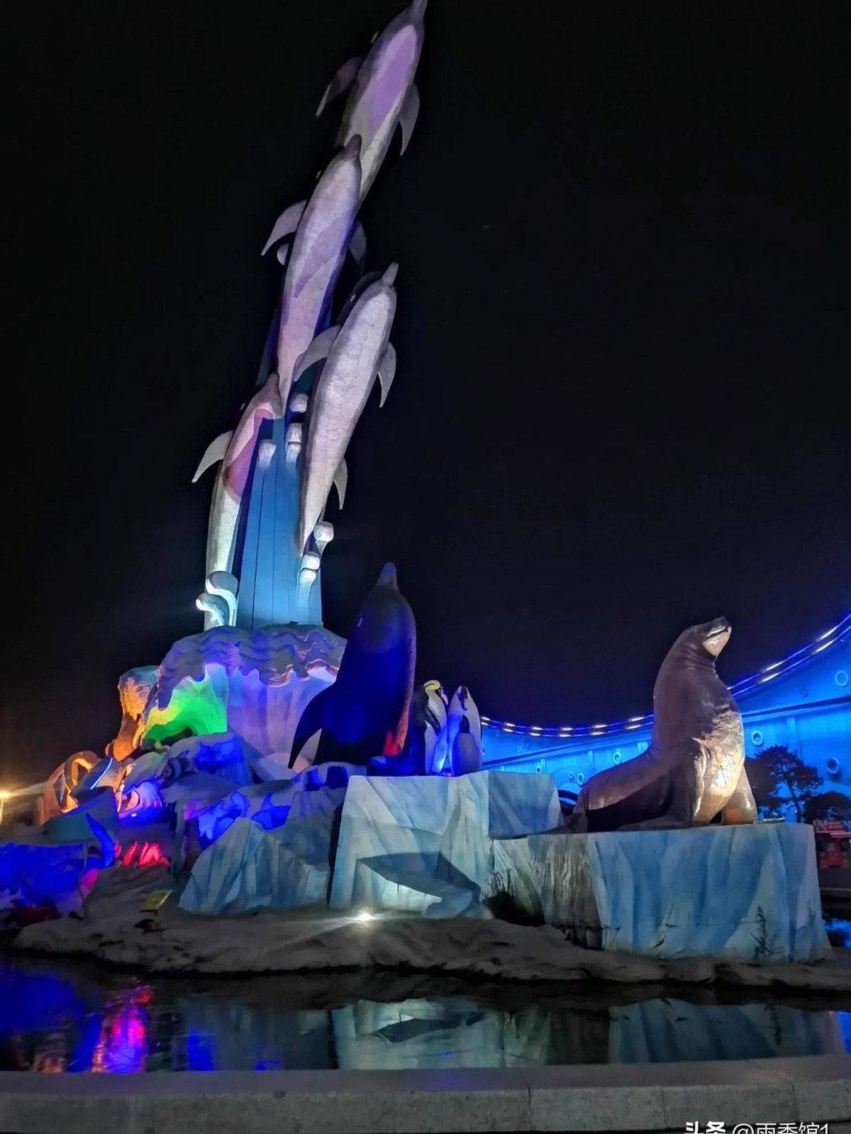 酒店旁边,欧乐堡海洋极地世界和梦幻世界的灯光也亮了起来,远远望去,璀璨夺目,像两颗闪亮的明珠。我沿着路走,夜色中,这些建筑群显得更加神秘而壮观。这片区域显然是一个大型的旅游度假区,规划完善,气势恢宏。据我了解,节假日和天气好的时候,这里人山人海,热闹非凡。