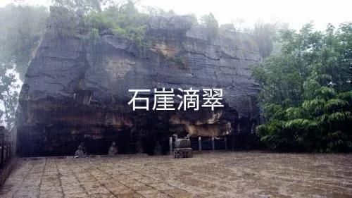 八景之七:石崖滴翠,石崖即芒山夫子崖,又名孔夫子避雨处,位于永城芒砀山中夫子山南坡,有一个深六七米、阔二十米的山洞,因当年孔曾在此避雨而得名。雨过天晴后,孔子让弟子们把淋湿的书籍搬到洞外的平台上晾晒,直到将书籍全部晾晒干后,才开始了新的行程。后来,孔子避过雨的这座山被称夫子山,当地百姓说也许是孔子治学的精神感动了老天,从此,“晒书台”上一年四季便不再下露水。“石崖滴翠”成八景之一。