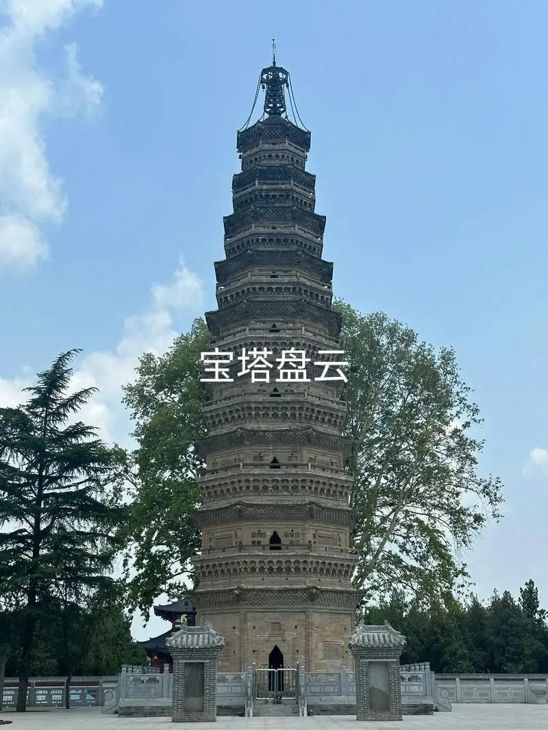 永城崇法寺塔始建于隋,这座塔为八角楼阁式九层砖塔,高30多米,底层直径7.7米。上为覆钵、相轮、伞盖和宝瓶组成的塔刹。塔体为椎柱形,每层檐下都有仰莲托着。抬望塔身,如九朵莲花竞相开放。塔每层都有东西南北四门。入角皆饰有石龙头,石龙头皆系一铁铃,和风习习,铿锵齐鸣,悦耳动听,“宝塔盘云”成八景之一。