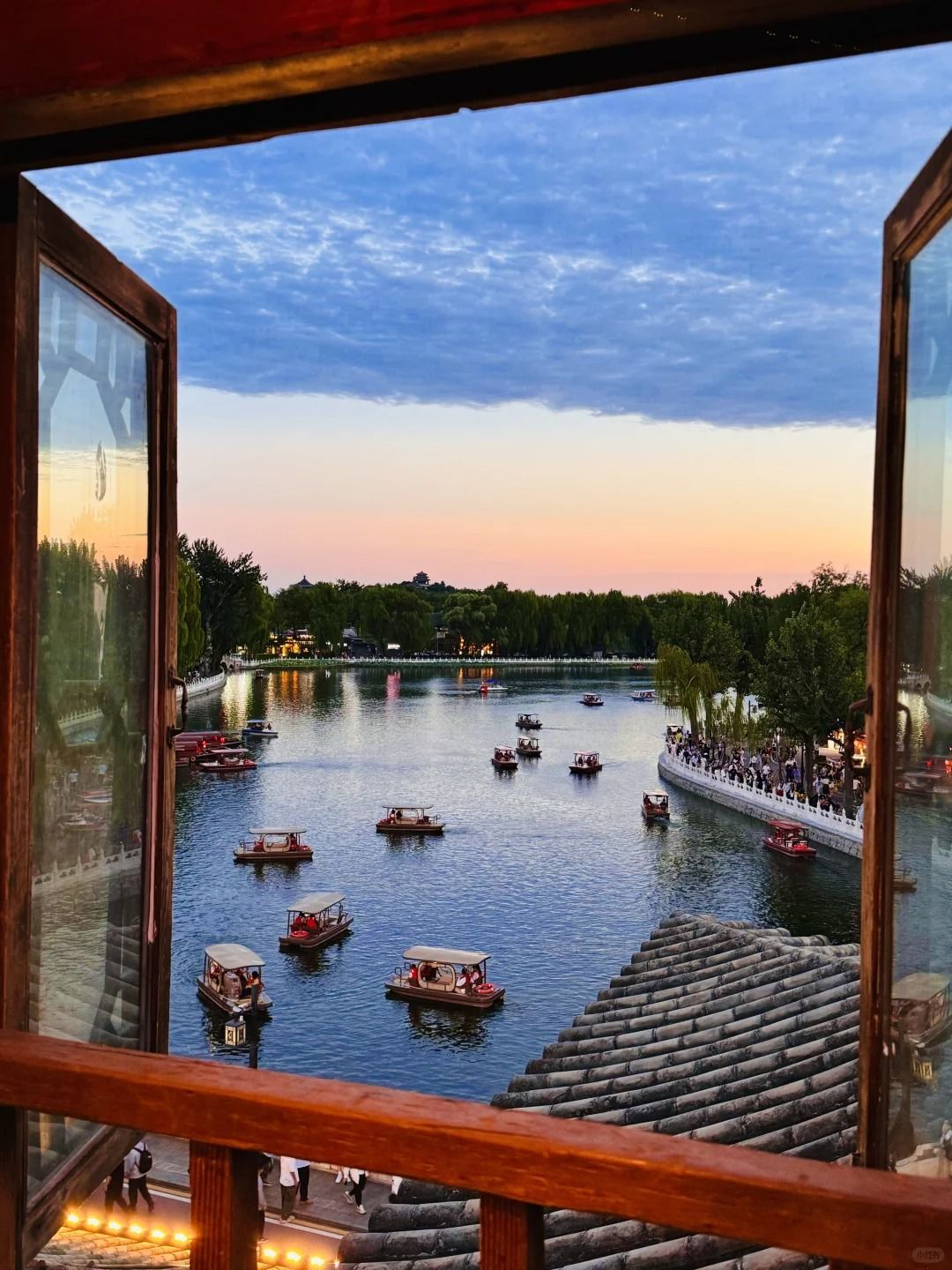最后来到糖房咖啡,透过这扇窗,凝视着落日余晖下的什刹海,实在是太治愈了。悠然漂浮于水面上的小船,宁静而唯美。晚风吹拂过脸庞,带走了无尽的疲倦与浮躁。窗外的一切都是那么舒适、惬意。
