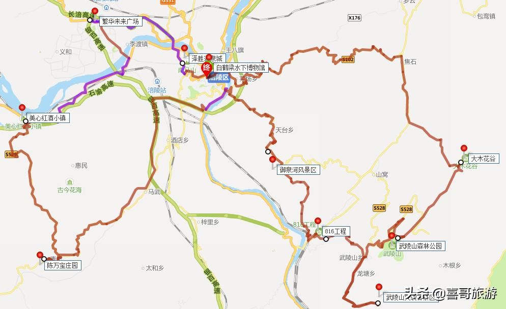 2、重庆涪陵区十大景点自驾游行程路线:重庆涪陵区-白鹤梁水下博物馆-泽胜温泉城-攀华未来广场-美心红酒小镇-陈万宝庄园-御泉河风景区-816工程-武陵山大裂谷景区-武陵山森林公园-大木花谷-重庆涪陵区。