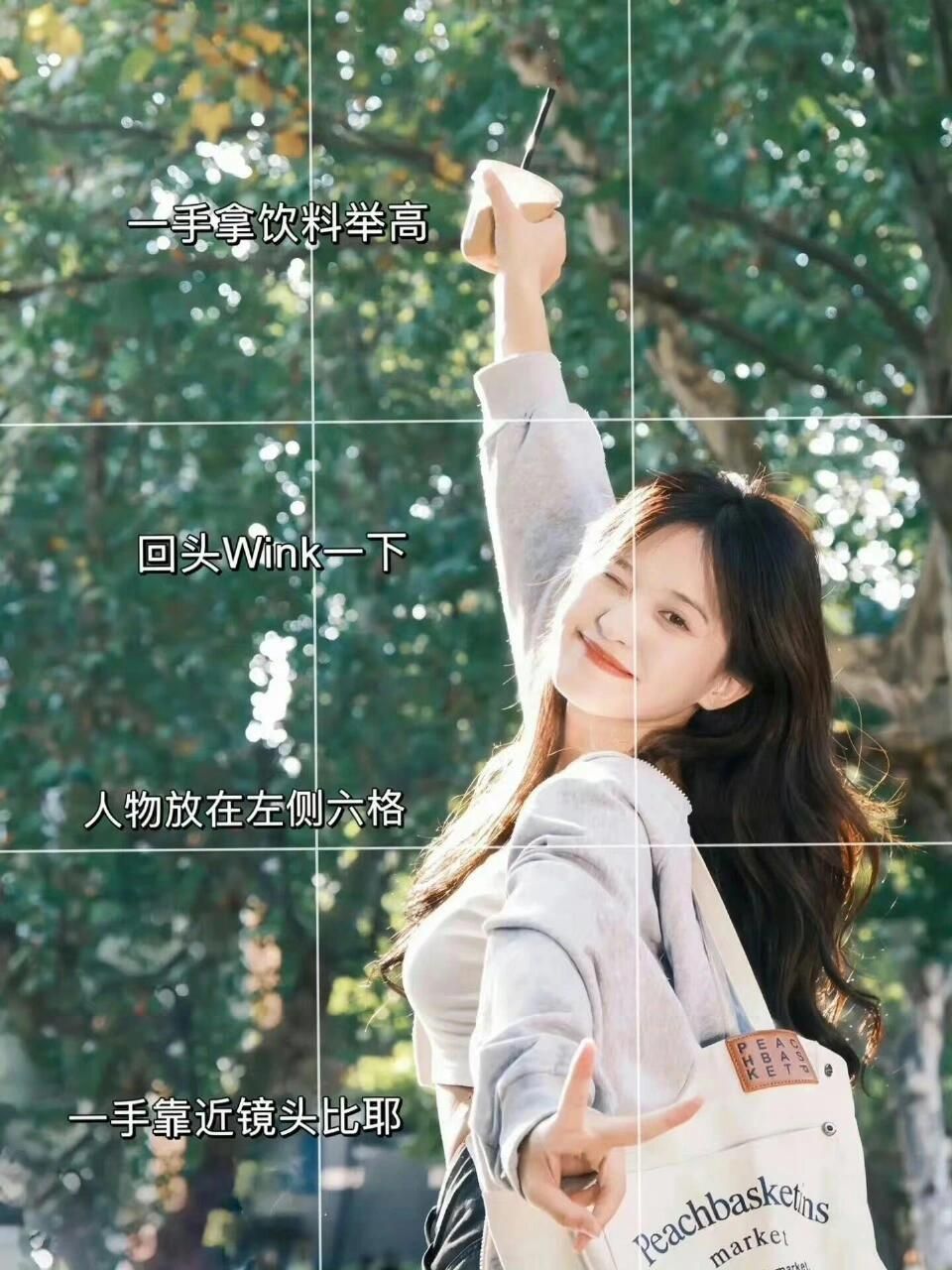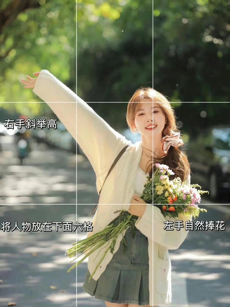 如果你喜欢手持道具拍照,可以试试这个出游拍照姿势。将自己放在画面六格位置,右手斜着举起来,左手自然捧花。这样的姿势不仅让你看起来更加优雅,还能利用花朵增添一些自然的元素,让照片更加生动自然。
