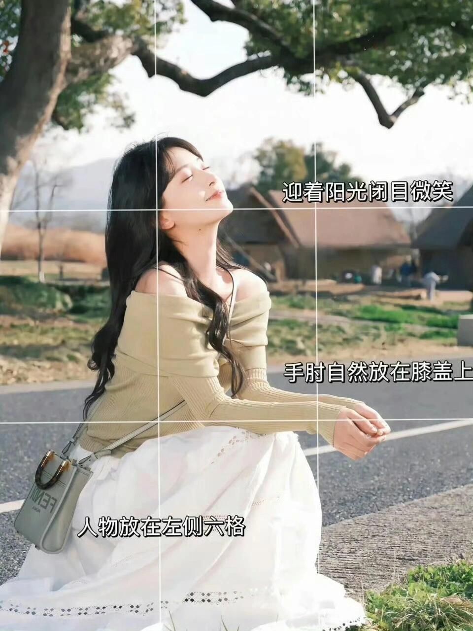 在阳光明媚的日子里,这个出游拍照姿势是个不错的选择。侧蹲在画面左侧六格位置,手肘自然放在膝盖上,闭目微笑,感受阳光的温暖。这种姿势让你的照片充满了自然的气息,微闭的双眼和微笑的表情更是能传达出一种安逸和放松的感觉,很自然好看。