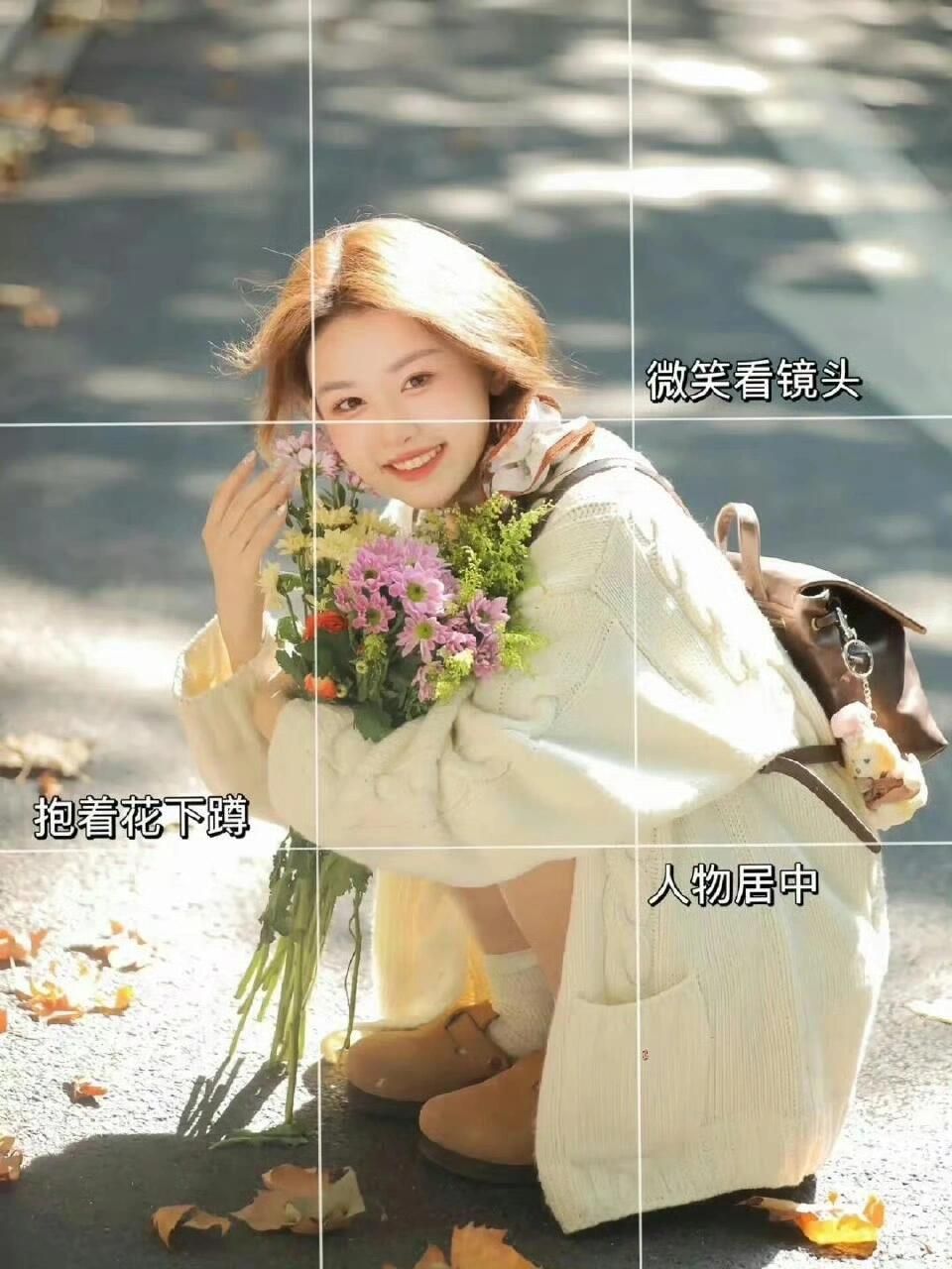 6. 侧身抱花蹲下,微笑看镜头,人物居中