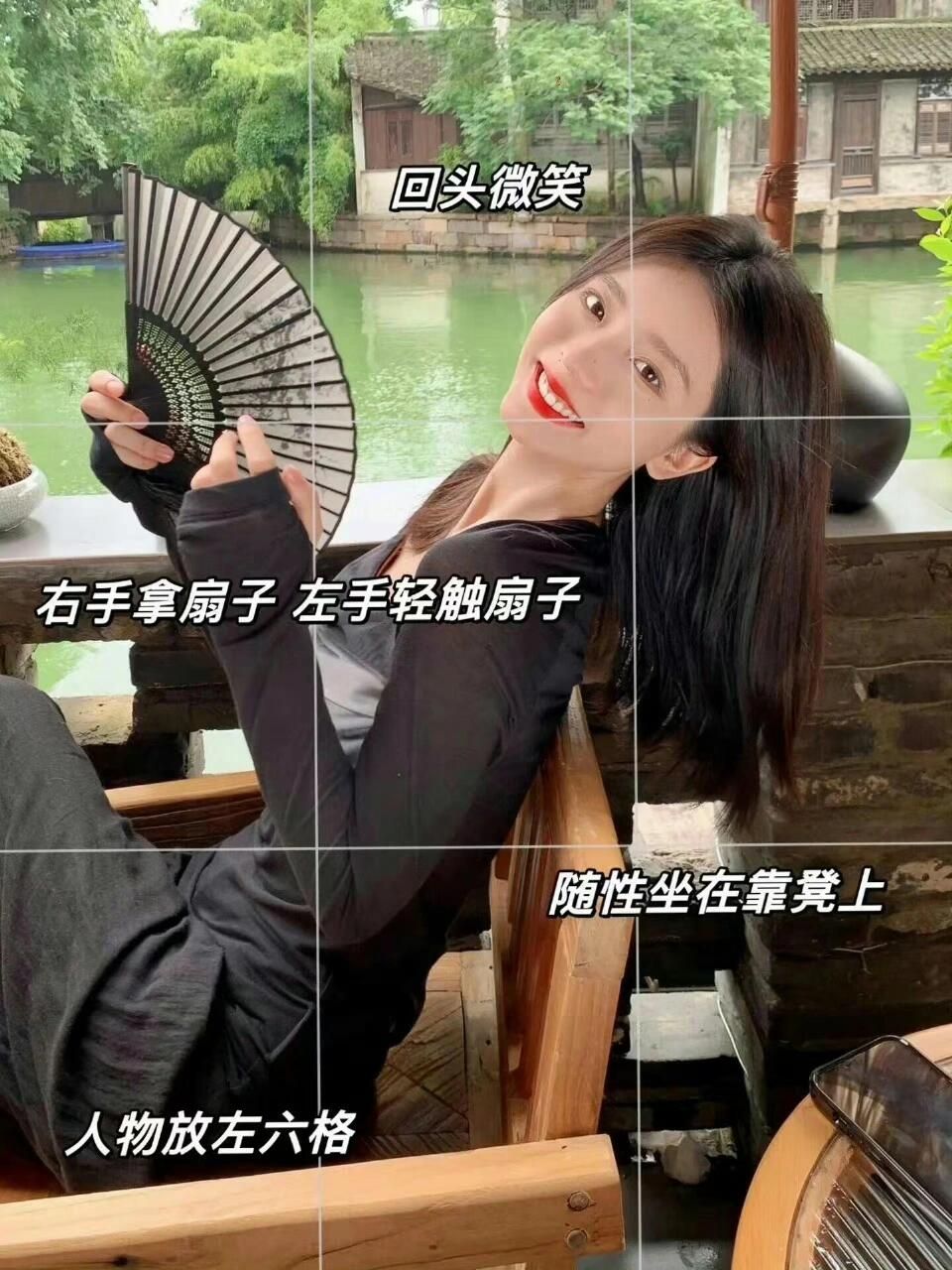 最后一个出游拍照姿势是非常随性的拍照姿势。侧靠在凳子上,右手拿扇子,左手轻轻摸着扇子,回头微笑。这样自然随性的姿势不仅能让你看起来很放松,还能通过小道具增添一些独特的风格,很自然好看。