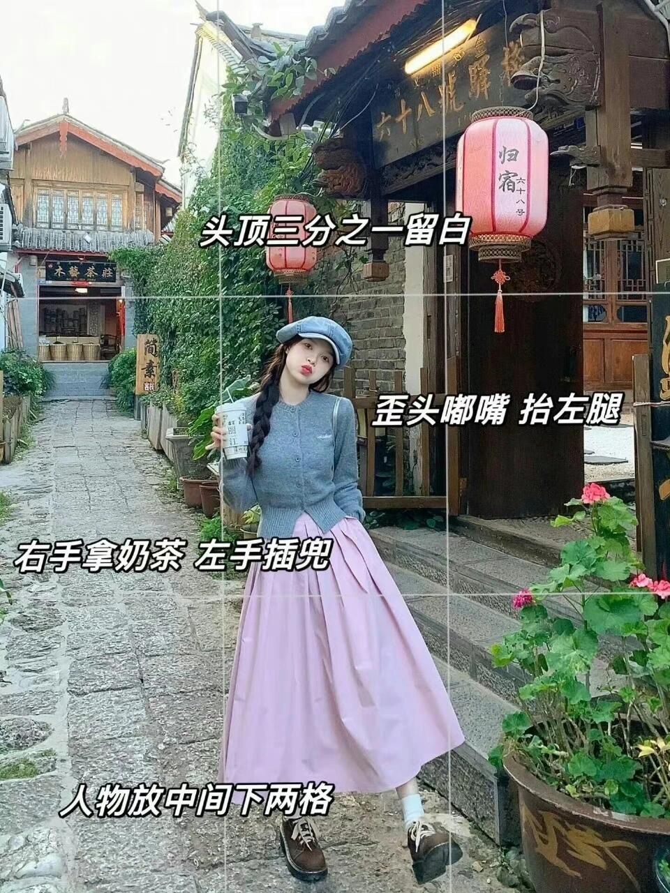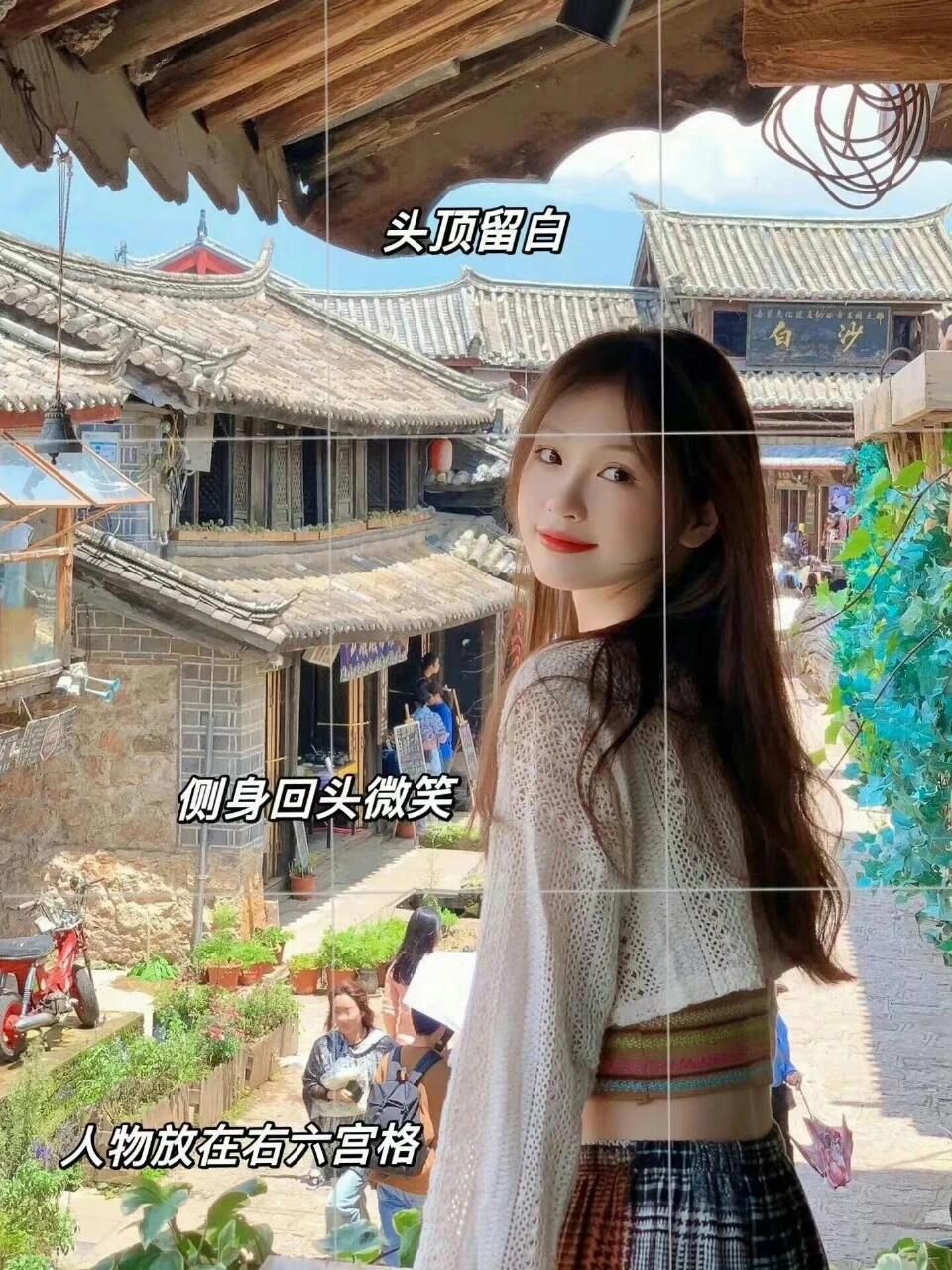 这个出游拍照姿势可以说是经典中的经典。将自己放在画面右侧六格位置,侧身回头微笑,头顶留白。这样的构图和姿势不仅能让你的照片看起来自然,还能突出你灿烂的笑容,让整个画面充满活力。