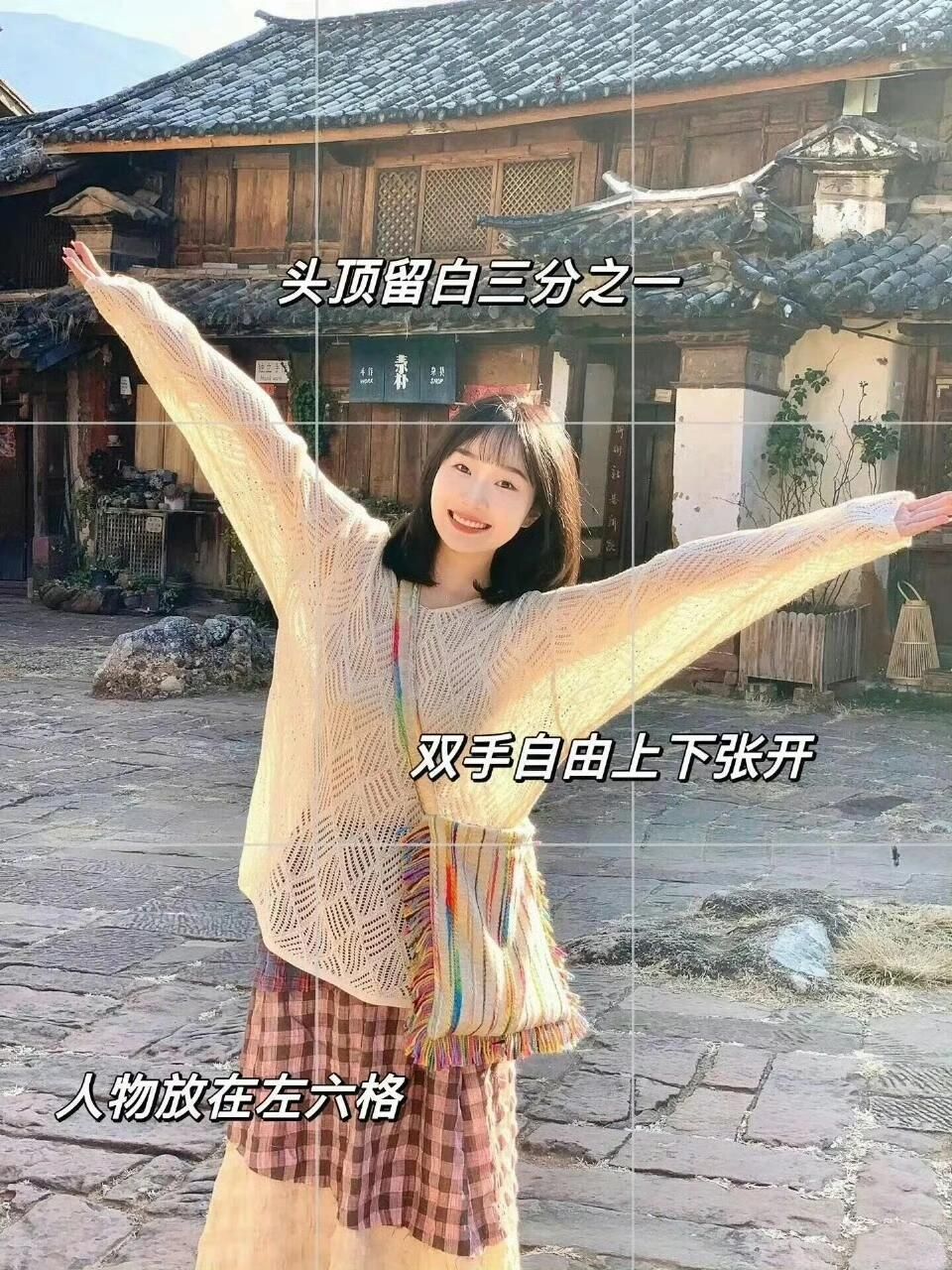 在出游拍照时,构图也是非常重要的。将人物放在画面的左侧六格位置,双手自由地上下张开,头顶留白三分之一。这样的构图不仅让照片看起来更有层次感,而且能突出主体,让你的照片显得更加自然和谐,很好看。