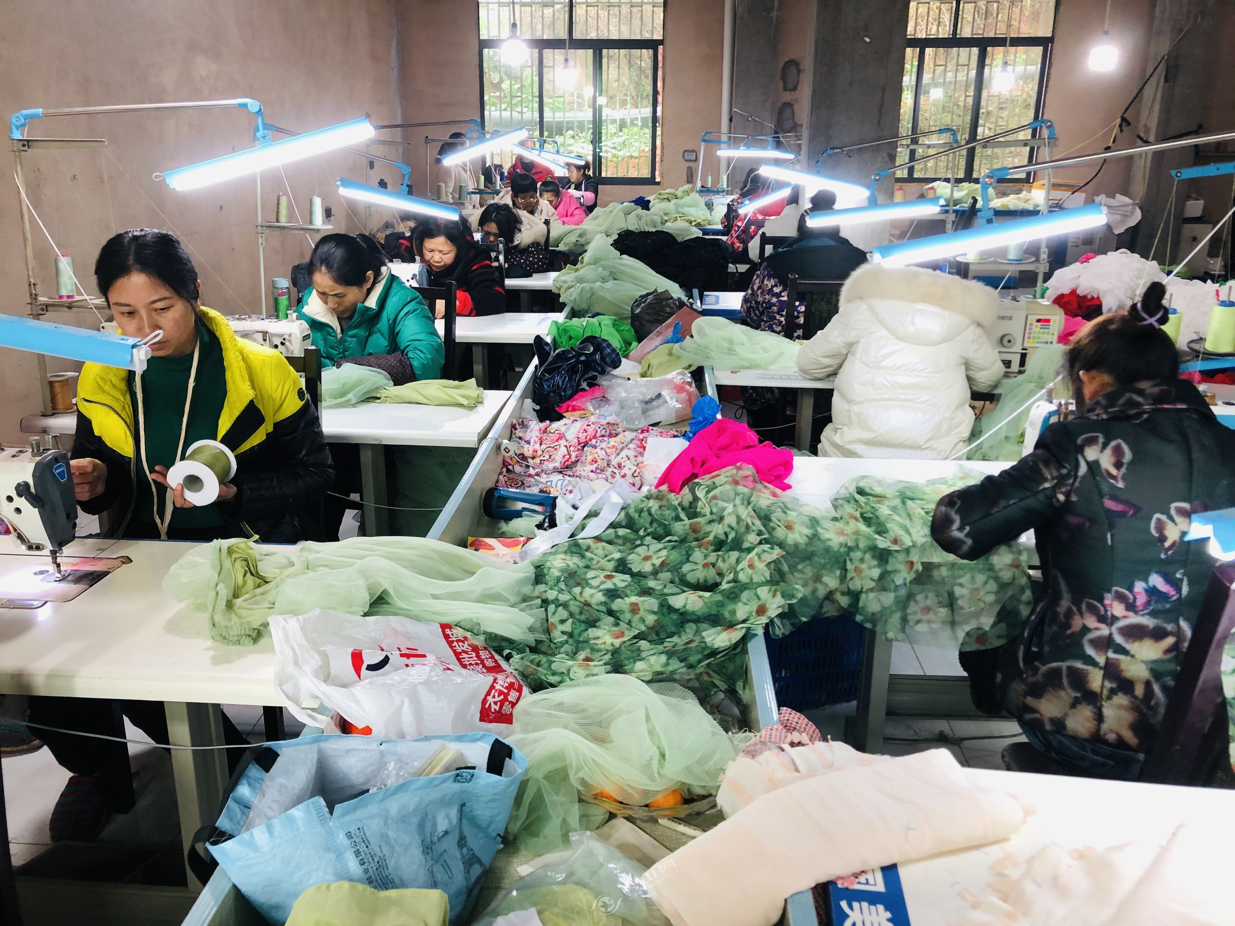 目前,云兴服饰生产车间内一片繁忙,几十名群众正在服装生产流水线上进行着服装加工。