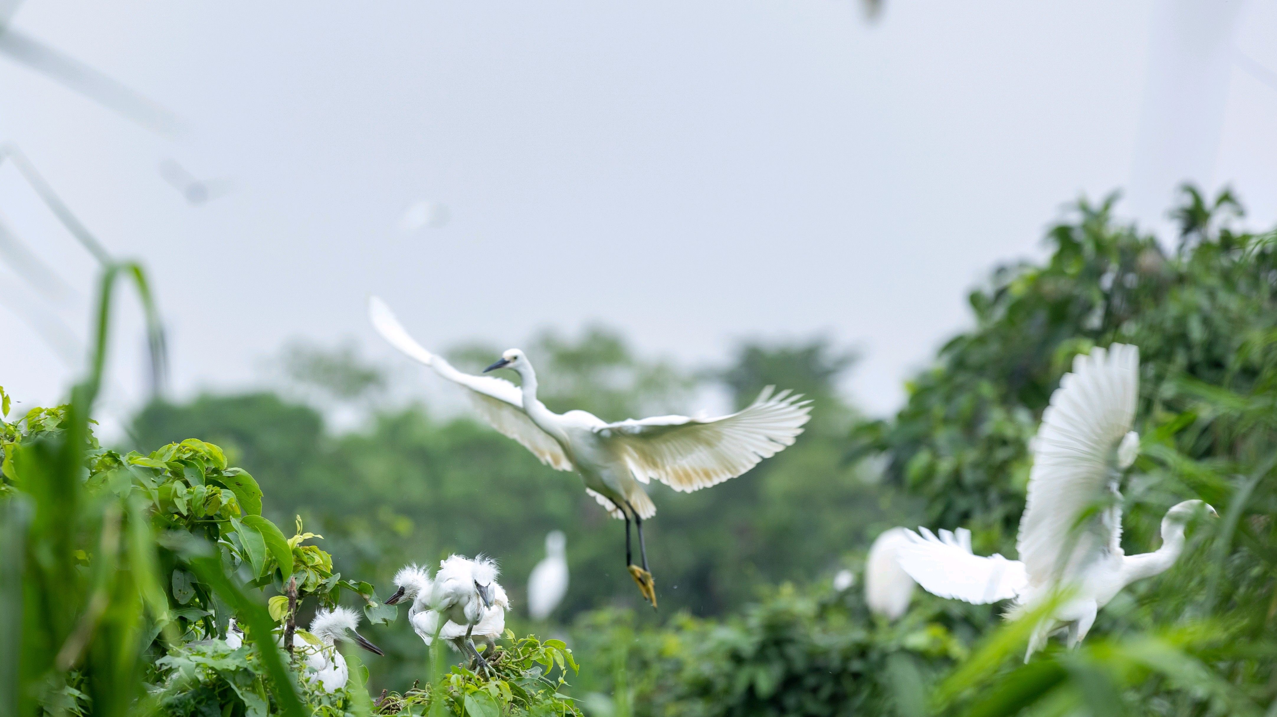 成千上万只鹭鸟飞舞鸣叫,走在湿地公园步道上,抬头就能看见鸟窝,游人可近距离与鹭鸟来一场亲密接触。鹭鸟天下开园首日,就有8000人次游客入园参观,漫步在万鸟翔集、鸟鸣虫吟的世界中,感受自然生态之美。
