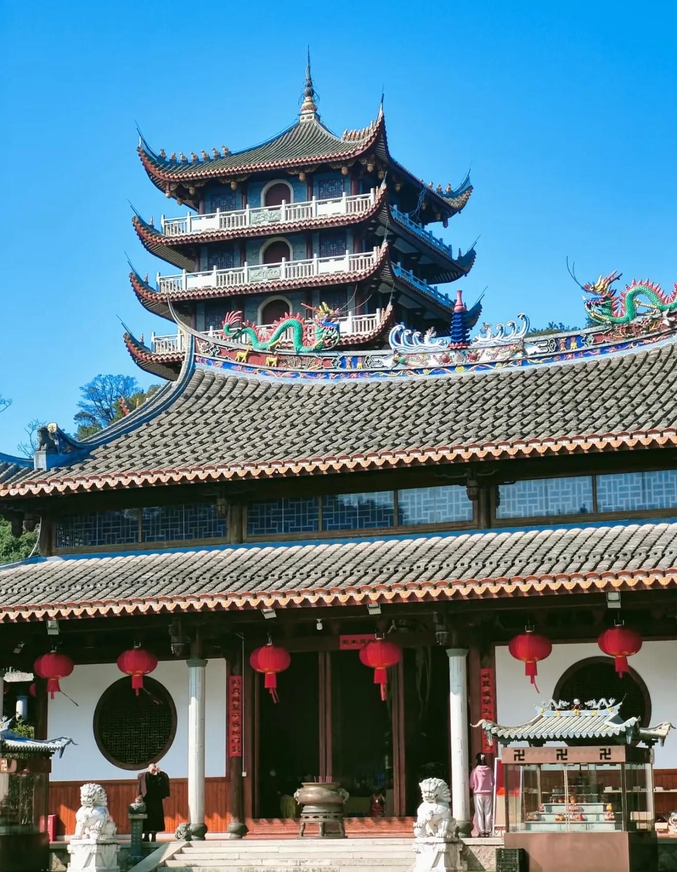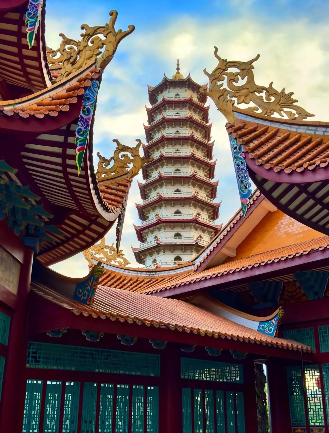 一进入寺庙,便能看到放生池上的九曲桥,犹如江南园林般婉约,曲径通幽。池内有许多和信徒放生的乌龟,它们在水中自由自在地游弋,为寺庙增添了一份生,机与灵动。沿着小路前行,塔影湖光、红荔翠竹相互映衬,美不胜收。