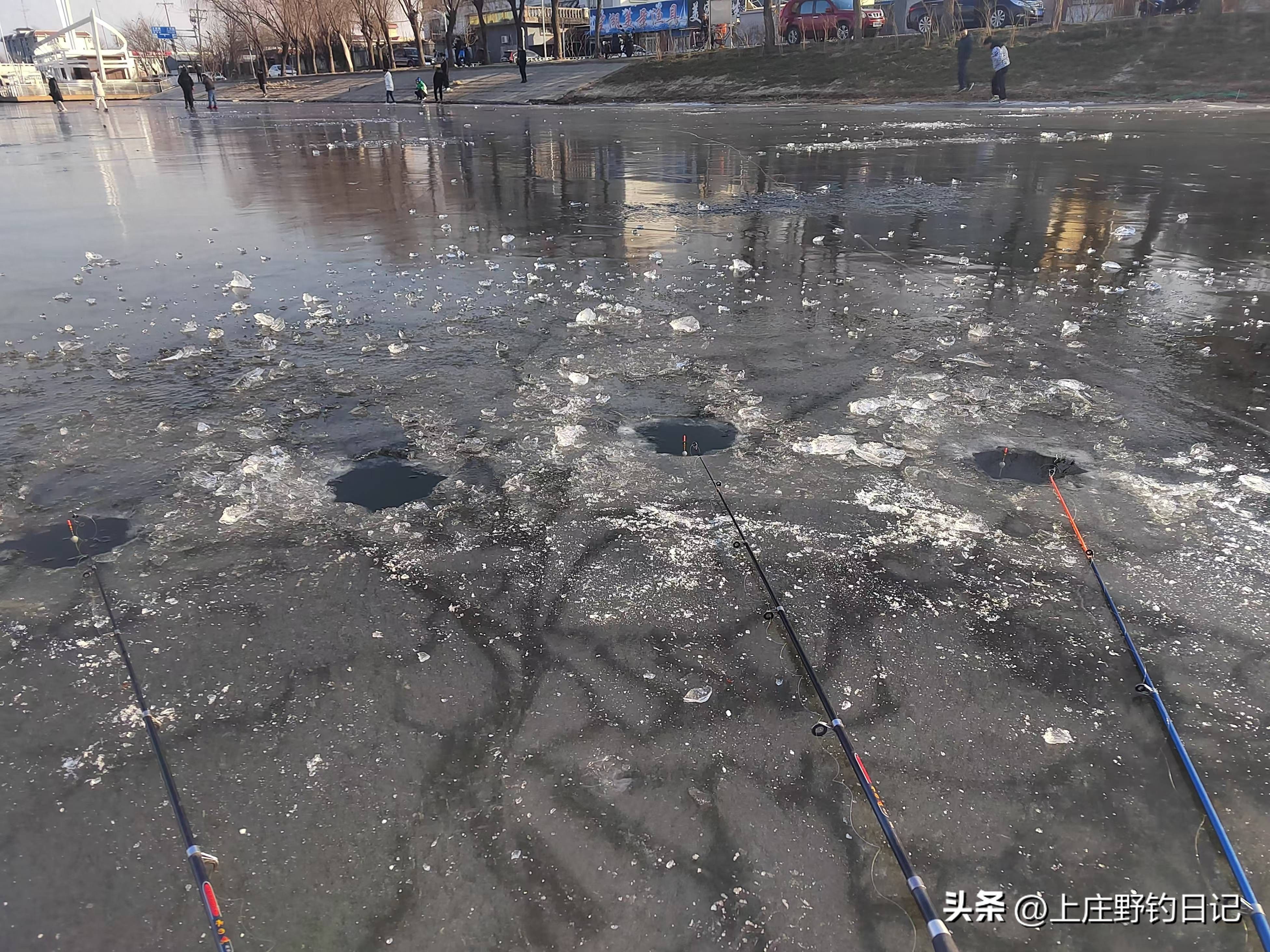 要想上鱼,等不是办法,必须要换地方。但今天时间不多,不打算去北边了,太远,搬家费劲。去年有一段时间西边南岸附近鱼口还行,往西走了二十来米,在相对更靠近岸边的地方凿了3个眼。