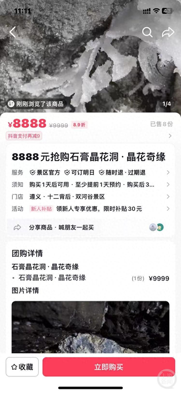 据短视频平台“十二背后”官方账号“本店团购”栏目所显示的页面,团购产品名称为“石膏晶花洞·晶花奇缘”,挂牌价9999元/份,打折后8888元/份,购买须知显示,产品需要提前1天电话预约,每份包含1名成人。截至5月11日已售8份。