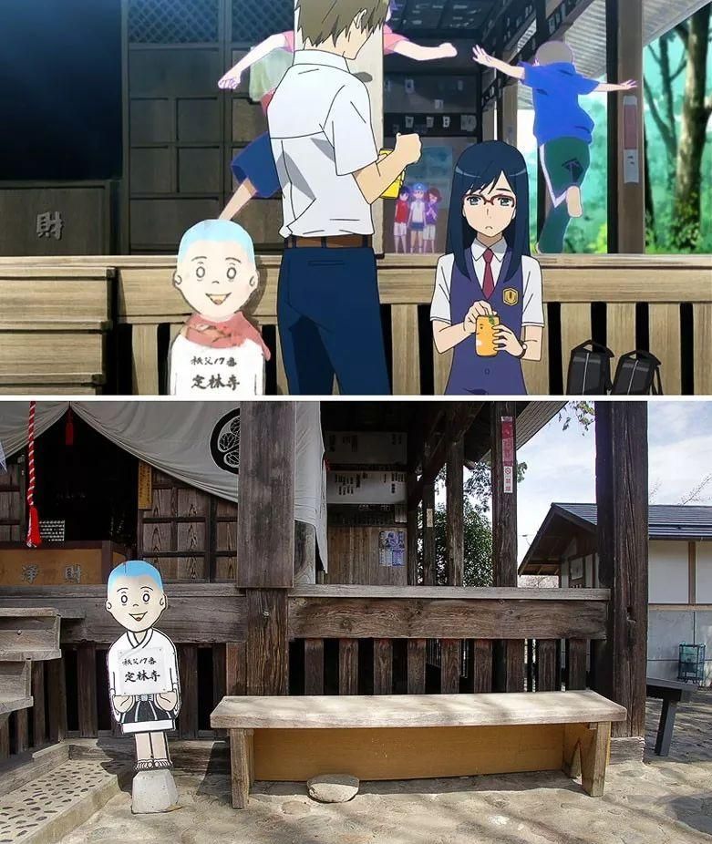 这个场景,取景于日本秩父市定林寺,动漫里的立牌小和尚是真实存在的。定林寺始建于南朝,留下了“达摩崖”等这样的名胜古迹,定林寺的那朵花,让这里成为了一处旅游胜地,每年来这里的游客数量远远超过前来朝拜的信徒。