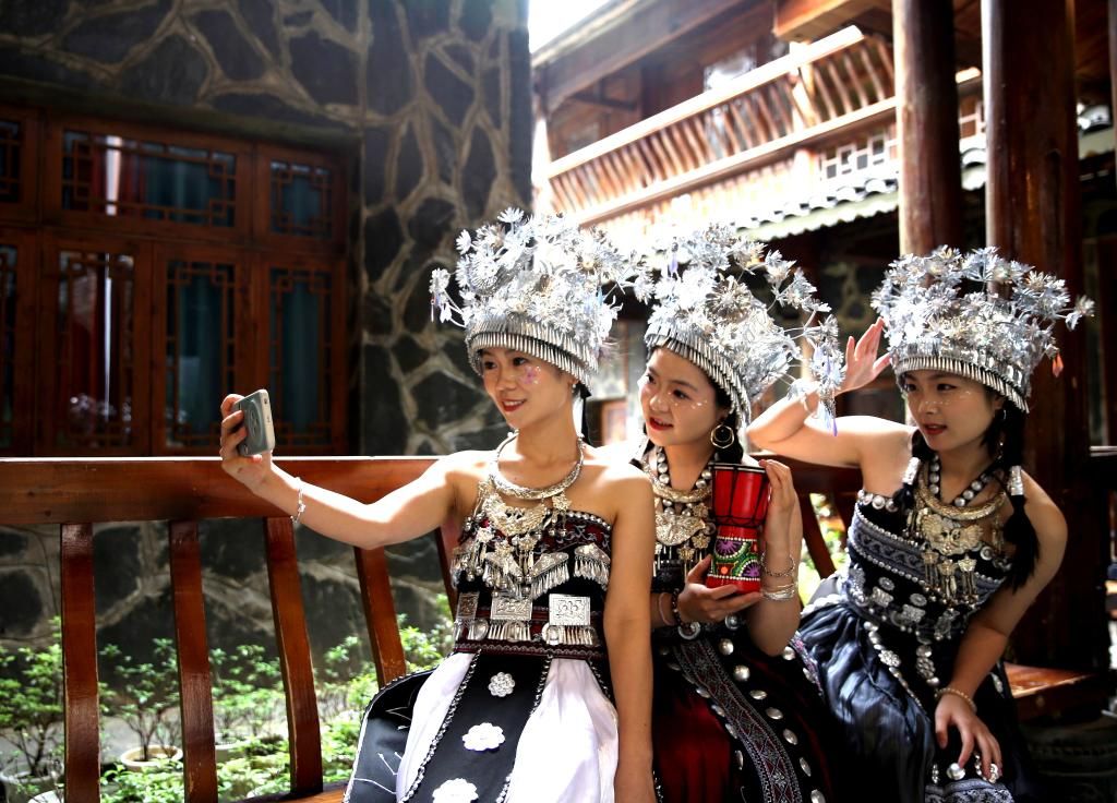 游客在西江千户苗寨内自拍留念。新华社发(余天英摄)