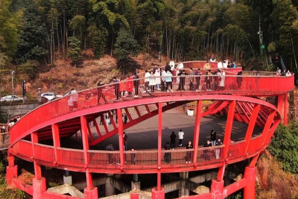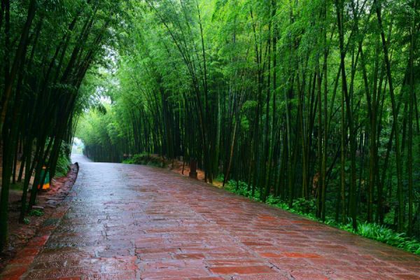 竹海深处的翡翠长廊,路面是由红砂石铺成,两旁密集的老竹拱列,红色地毯式的公路与绿色屏风般的楠竹交相辉映。