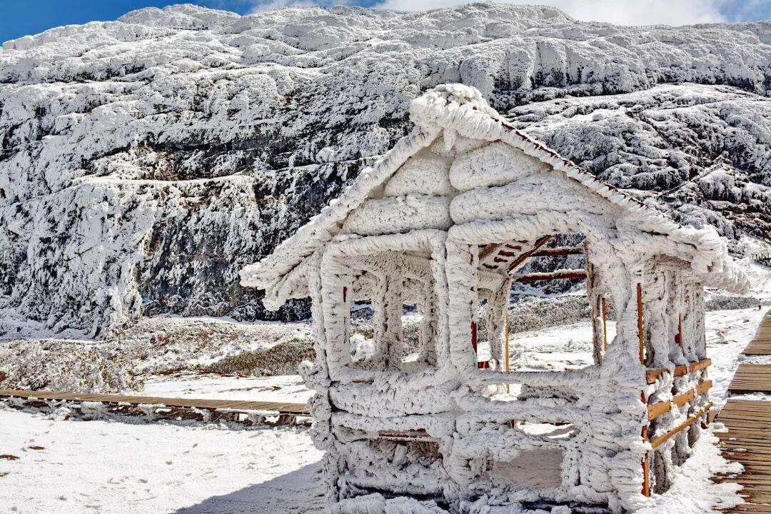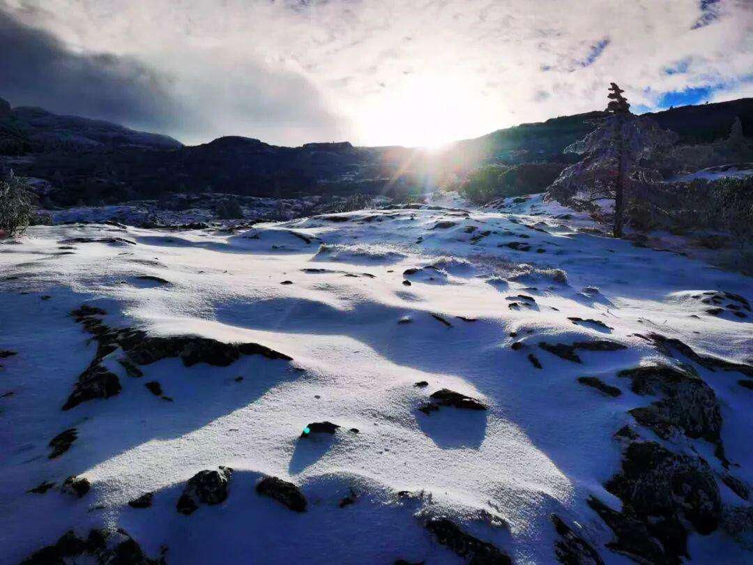 当你踏入轿子山的那一刻,便走进了一个晶莹剔透的童话世界。每一棵树都被冰凌覆盖,银装素裹,这就是雾凇,它用冰晶编织出了一幅幅梦幻的画卷,让人沉醉其中。轻轻触碰,冰花四溅,宛如冬日赞歌。