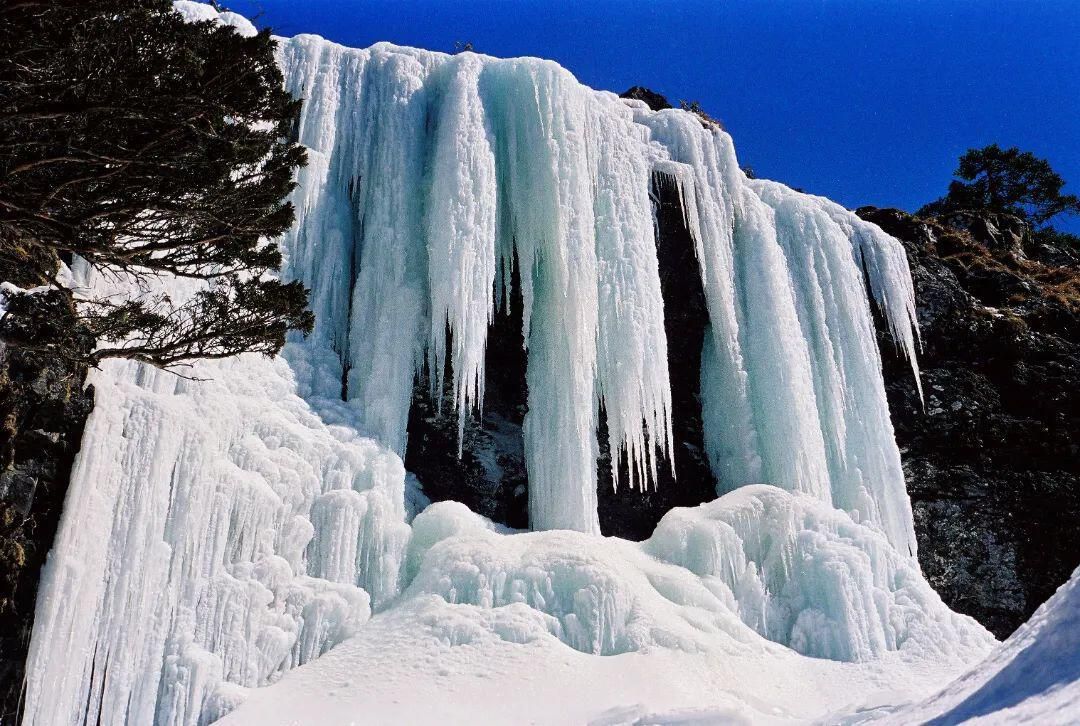 瀑布的水流在低温下凝固成冰,形成了一道道壮观的冰帘。它们或高耸入云,或低垂谷底,宛如凝固的时间,诉说着冬天的故事。站在冰瀑前,你仿佛能听到那来自远古的呼唤,感受到大自然的鬼斧神工。