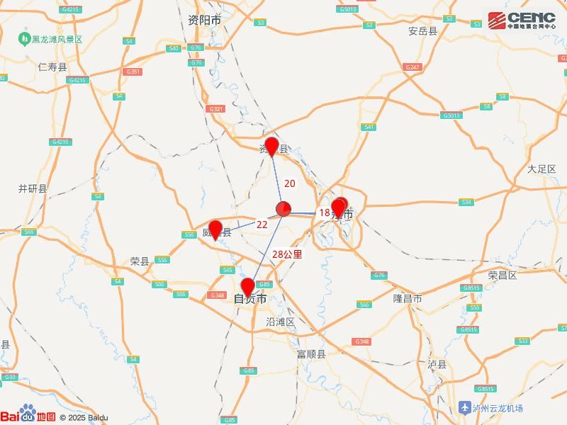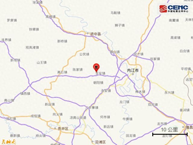 震中距市中区17公里、距东兴区18公里、距资中县20公里、距威远县22公里、距大安区28公里,距内江市16公里,距成都市142公里。