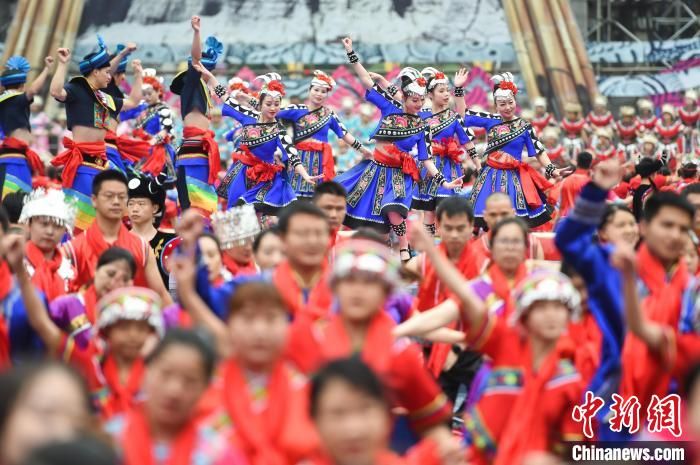 2023年5月26日,万余名身着盛装的苗乡儿女载歌载舞,欢庆苗族传统节日踩花山节。中新网记者何蓬磊摄