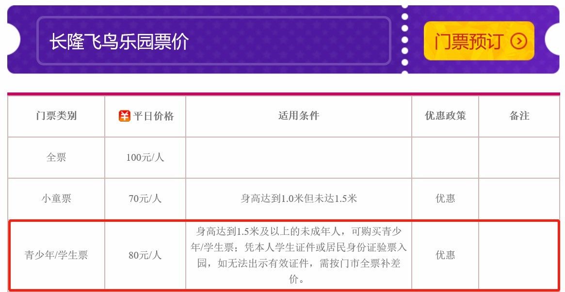 7、2大1长者:适用于65岁以上长者(持本人有效身份证件验证入园)。 特别优惠 门票类别 价格 备注 家庭乐(2大1小或2大1长者) 450 2大1小:适用于身高1.2米至1.5米儿童; 2大1长者:适用于65岁以上长者(持本人有效身份证件验证入园)。 大学生 165 全日制在校中专生、中技生、高职生、大学生、研究生凭有效证件 购票入园。