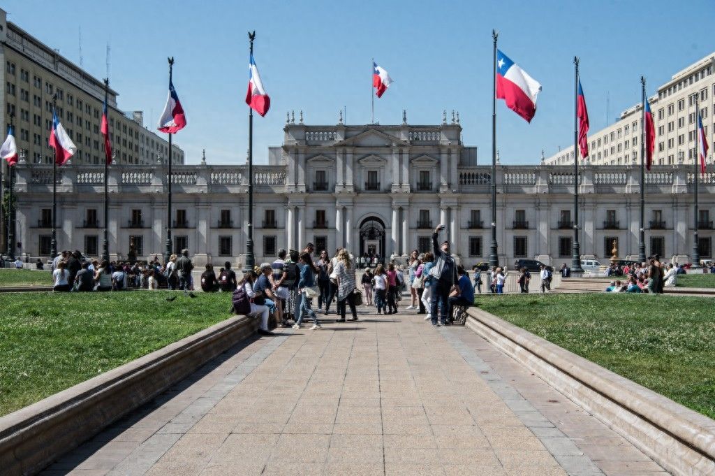 新华社照片,圣地亚哥,2016年11月18日(国际·出访配合)(5)智利首都圣地亚哥11月14日,在智利首都圣地亚哥,人们在总统府拉莫内达宫外参观。圣地亚哥是智利首都和最大城市,位于智利中部,东依安第斯山,是一座有着400多年历史的古城,拥有丰富的旅游资源。新华社发(豪尔赫·比列加斯摄)