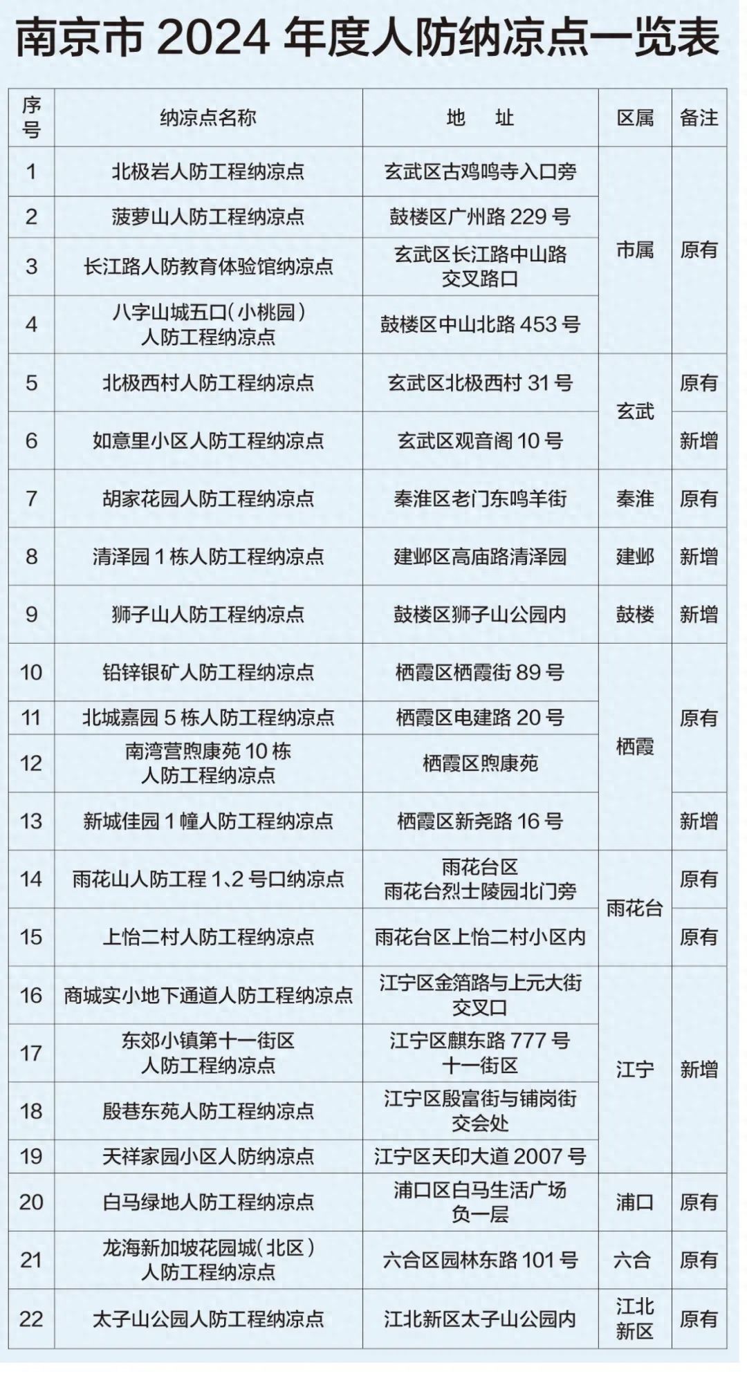2024年,市国动办根据实际需求,对人防纳凉点布局进行了适当调整和优化,保留原纳凉点14个,在建邺、玄武、栖霞、江宁新增纳凉点8个。结合群众过往诉求及实际需求,今年新增的8个纳凉点主要集中在风景名胜区、老旧小区和保障房周边,同时依据有纳凉需求、工程结构安全、交通便利、具备水电接入条件、工程内部设施完善、附近有公厕等条件进行选址优化。