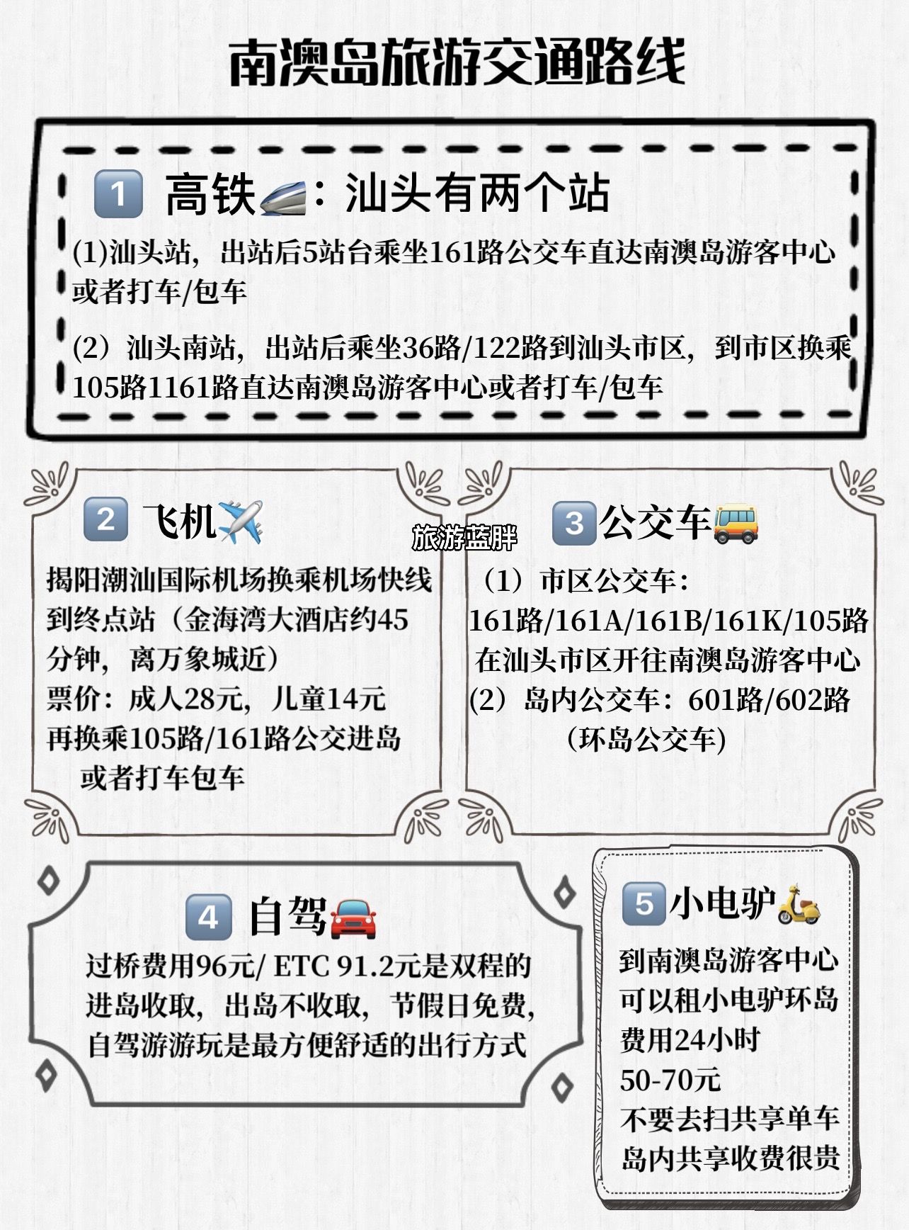 -汕头市区乘161路公交直达南澳岛(车程1.5小时),或轮渡(约40分钟,班次较少)