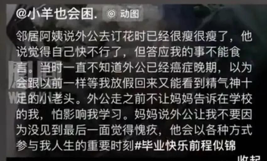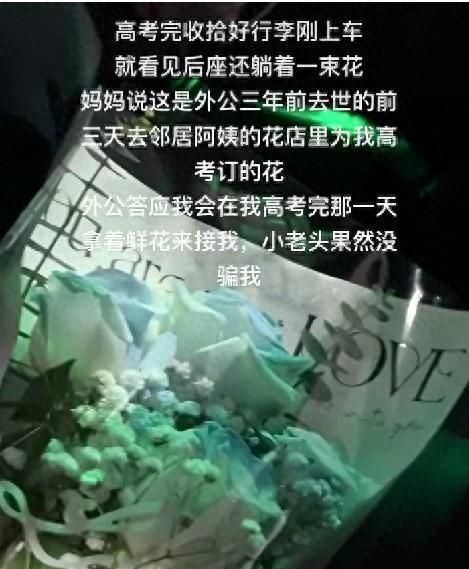 结果你猜怎么着?这花儿是女孩外公三年前就悄悄订好的。那时候外公已经被病痛折磨得不轻,身子骨弱得跟竹竿似的,但心里还惦记着外孙女的将来呢。他硬撑着跑到隔壁花店,精挑细选了一束花,还跟店主说好了,非得三年后今儿个送到她手里不可。店主那时候心里也没底,不知道自己这花店能不能撑到那时候,但一看外公那副皮包骨的样子,也就咬牙答应了。外公曾经拍着胸脯跟女孩保证,高考一完事儿,鲜花立马到位,给她好好庆祝一番。结果呢,外公虽然人走了,但这承诺却以一种超酷的“鬼畜”方式兑现了。女孩哭得稀里哗啦的,心里头明白,外公的爱啊,早就跟她血脉相连了。