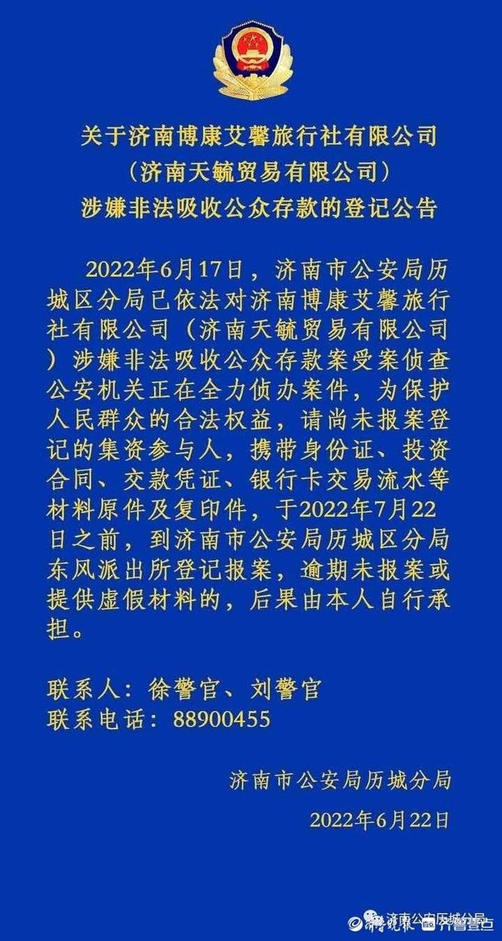 2022年6月17日,济南市公安局历城区分局已依法对济南博康艾馨旅行社有限公司(济南天毓贸易有限公司)涉嫌非法吸收公众存款案受案侦查公安机关正在全力侦办案件,为保护人民群众的合法权益,请尚未报案登记的集资参与人,携带身份证、投资合同、交款凭证、银行卡交易流水等材料原件及复印件,于2022年7月22日之前,到济南市公安局历城区分局东风派出所登记报案,逾期未报案或提供虚假材料的,后果由本人自行承担。