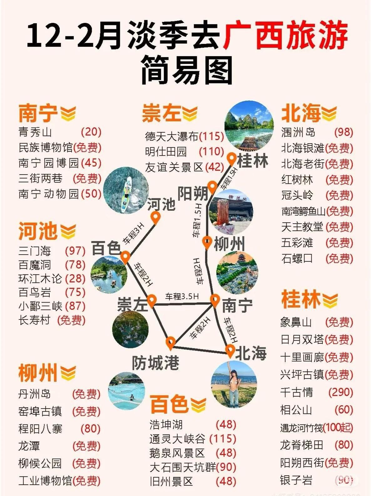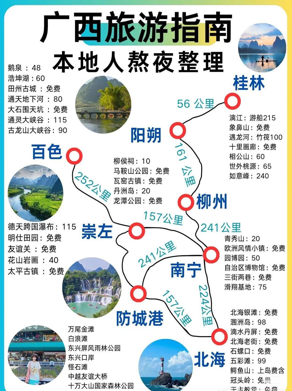 一些实用建议:阳朔啤酒鱼要先问价;涠洲岛船票提前三天买;柳州螺蛳粉推荐阿柠檬或曹妹;南宁的建政路和平西夜市值得一去;崇左德天瀑布下午12点到3点放水,效果最好。三月三假期酒店会涨价,2、3月份去漓江记得带外套,阳朔租电动车一天30块比较合理,涠洲岛海鲜市场下午5点最便宜,崇左自驾游比较方便。