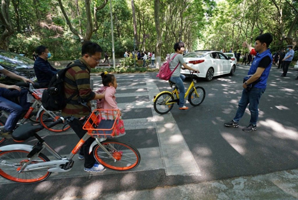 新华社照片,南京,2017年4月29日南京中山陵园风景区:骑车游客多 管理精细化4月29日,共享单车企业人员在景区道路上引导骑行游客前往共享单车停放点。当日是“五一”小长假的第一天,南京中山陵园风景区迎来游客17万人次,许多市民选择“绿色出行”,骑共享单车进入景区游玩。景区与共享单车企业携手进行精细化管理,倡导文明骑行、安全骑行、规范停放,共同维护安全有序的旅游环境。新华社记者 孙参摄