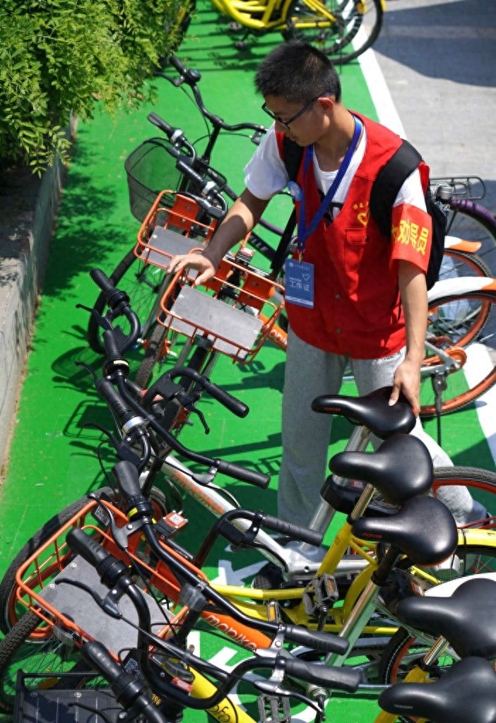 新华社照片,南京,2017年4月29日南京中山陵园风景区:骑车游客多 管理精细化4月29日,大学生志愿者在景区内一处共享单车停放点整理单车。当日是“五一”小长假的第一天,南京中山陵园风景区迎来游客17万人次,许多市民选择“绿色出行”,骑共享单车进入景区游玩。景区与共享单车企业携手进行精细化管理,倡导文明骑行、安全骑行、规范停放,共同维护安全有序的旅游环境。新华社记者 孙参摄