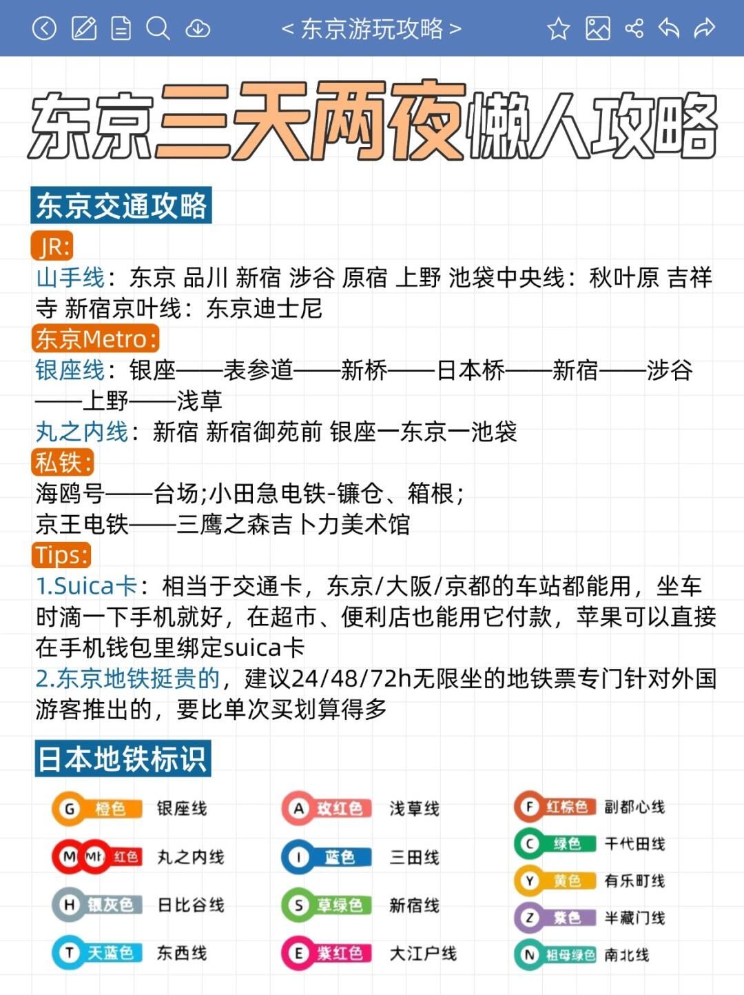 市内交通:东京都内的电车系统有发行各式各样的「一日券」,但东京市区的电车路线相当复杂,如果对东京交通没有一定程度的熟悉或把握,建议新手以「顺路、方便」为原则安排行程