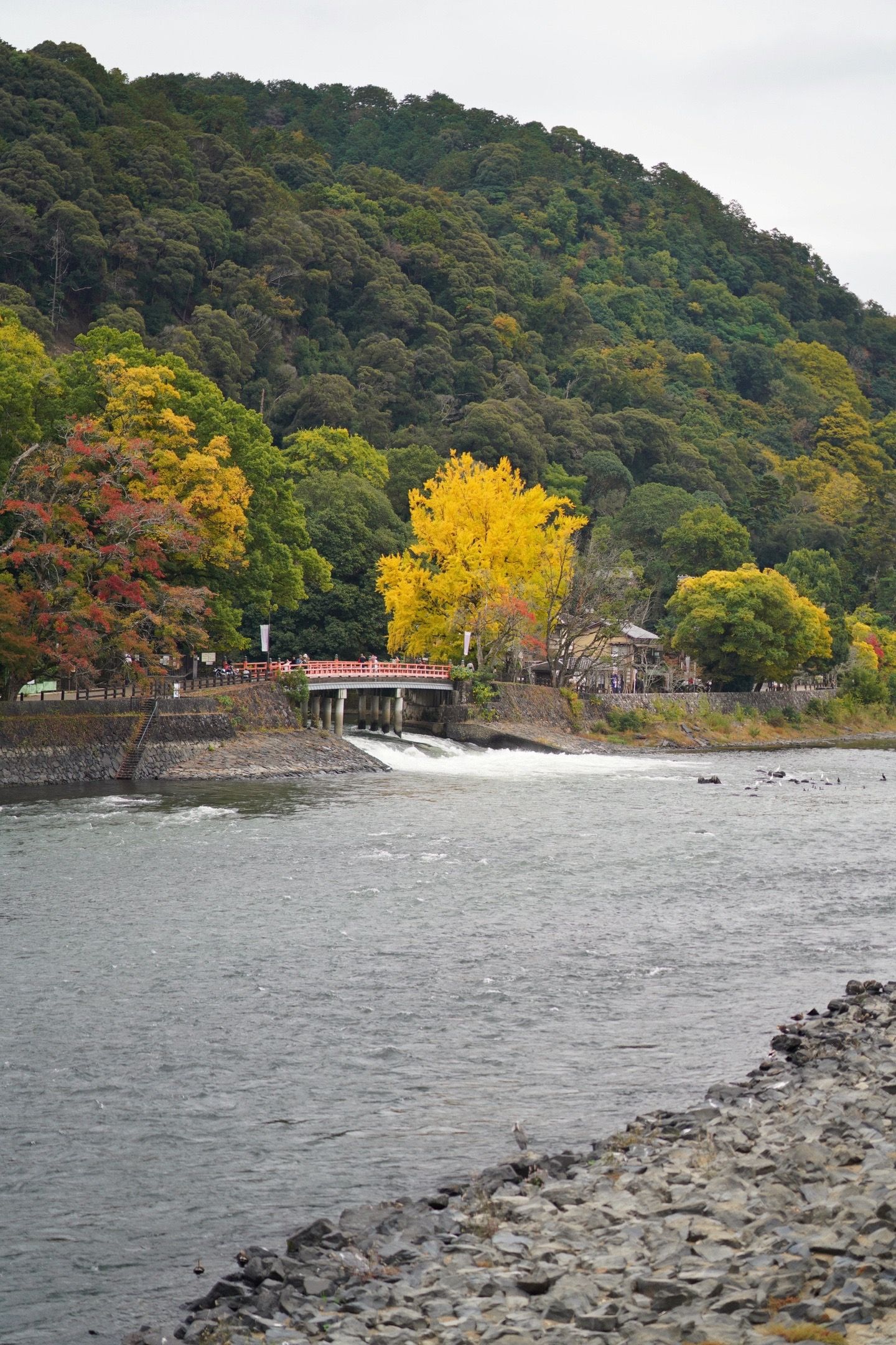 河对岸一直顺着河道走,红色的桥、黄色的巨大银杏树最为抢眼。