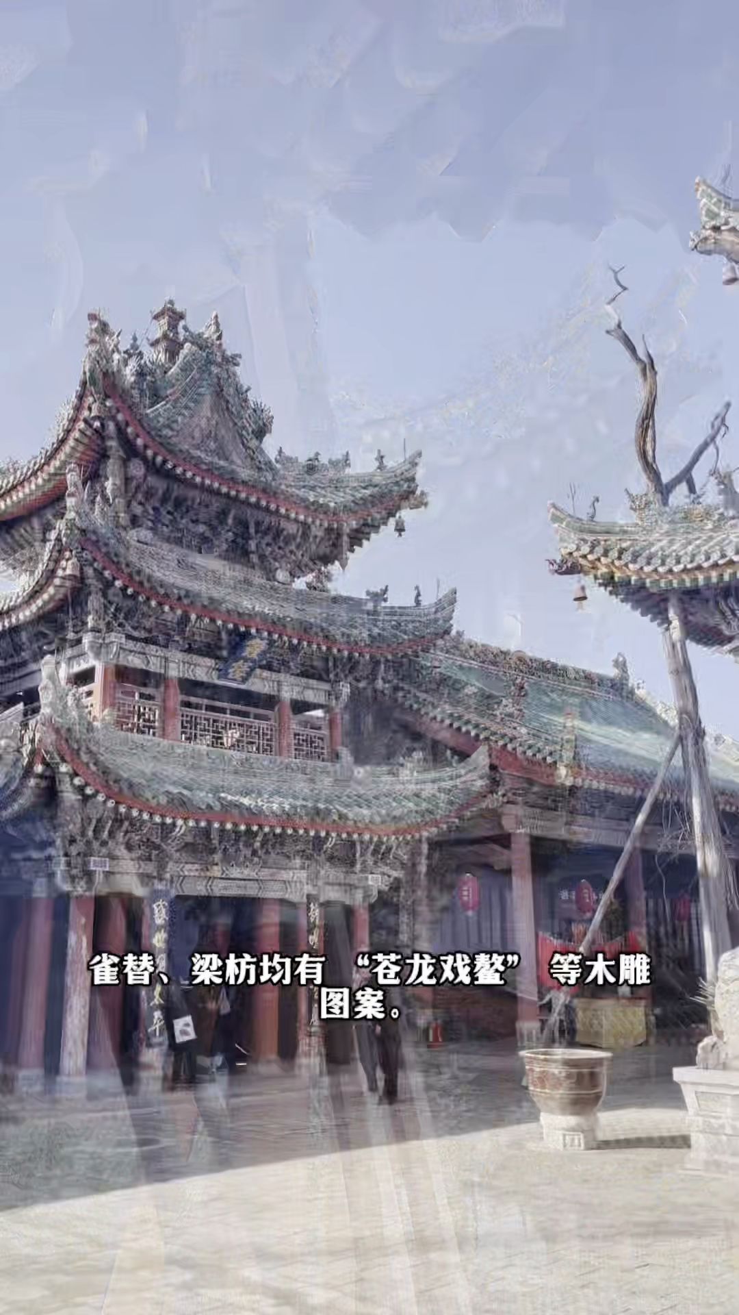 大殿和拜殿呈"勾连搭"形式,拜殿、歇山券棚顶、钟楼、鼓楼重檐歇山十字脊造型挺秀,脊饰华美,斗棋疏朗。寝宫为二层楼阁,通柱结构,底层周围廊各层檐下施五踩双昂或单昂斗棋,独特的建筑形式展现出古代工匠的高超技艺。其砖雕、木雕、石雕、琉璃栩栩如生。