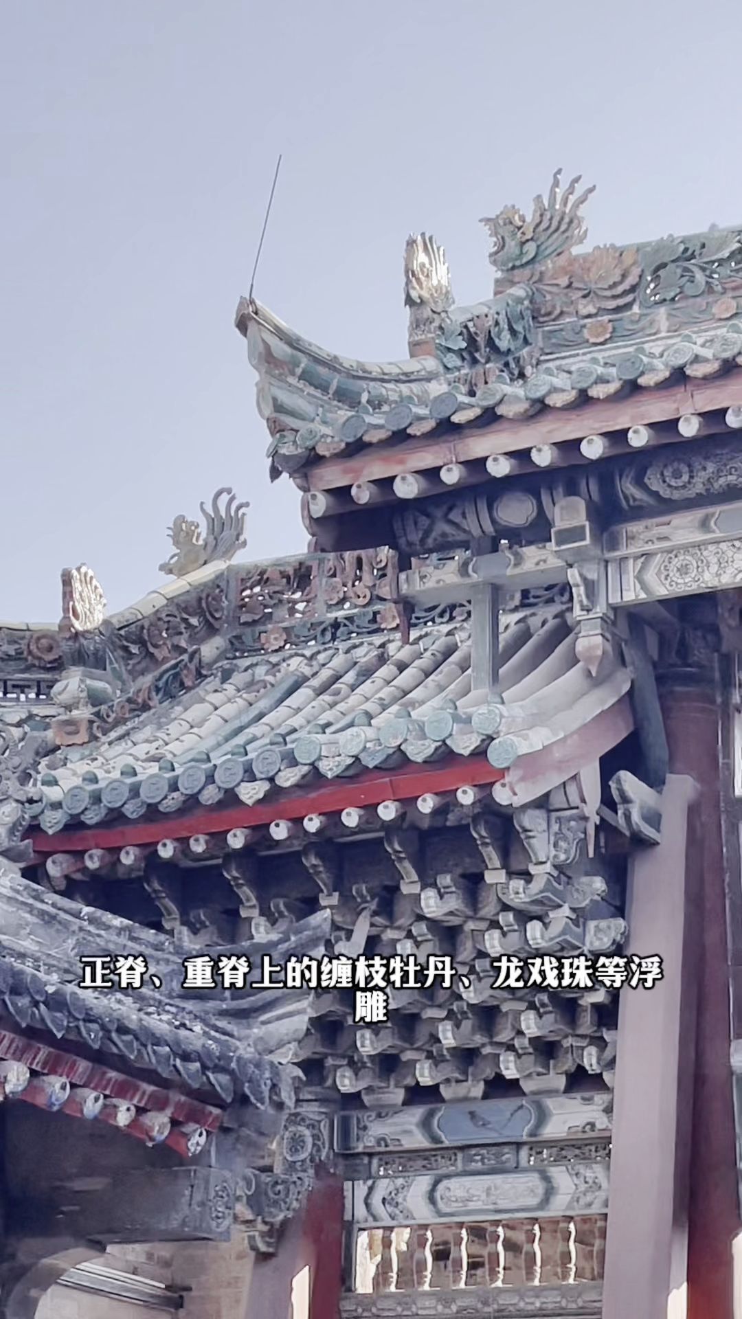 拜殿中的木雕数量众多,手法多样,所刻人物形神兼备。献殿内的石柱础上石雕工艺精湛绝伦,有象征吉祥的如意纹、寓意长寿的龟鹤纹等。全部建筑琉璃盖顶,钟鼓楼上的琉璃装饰细腻精致,在阳光的照耀下熠熠生辉。楼顶的瑞兽、仙人、武士等脊饰形态各异,正脊、重脊上的缠枝牡丹、龙戏珠等浮雕更是增添了一份华丽与祥瑞之气。