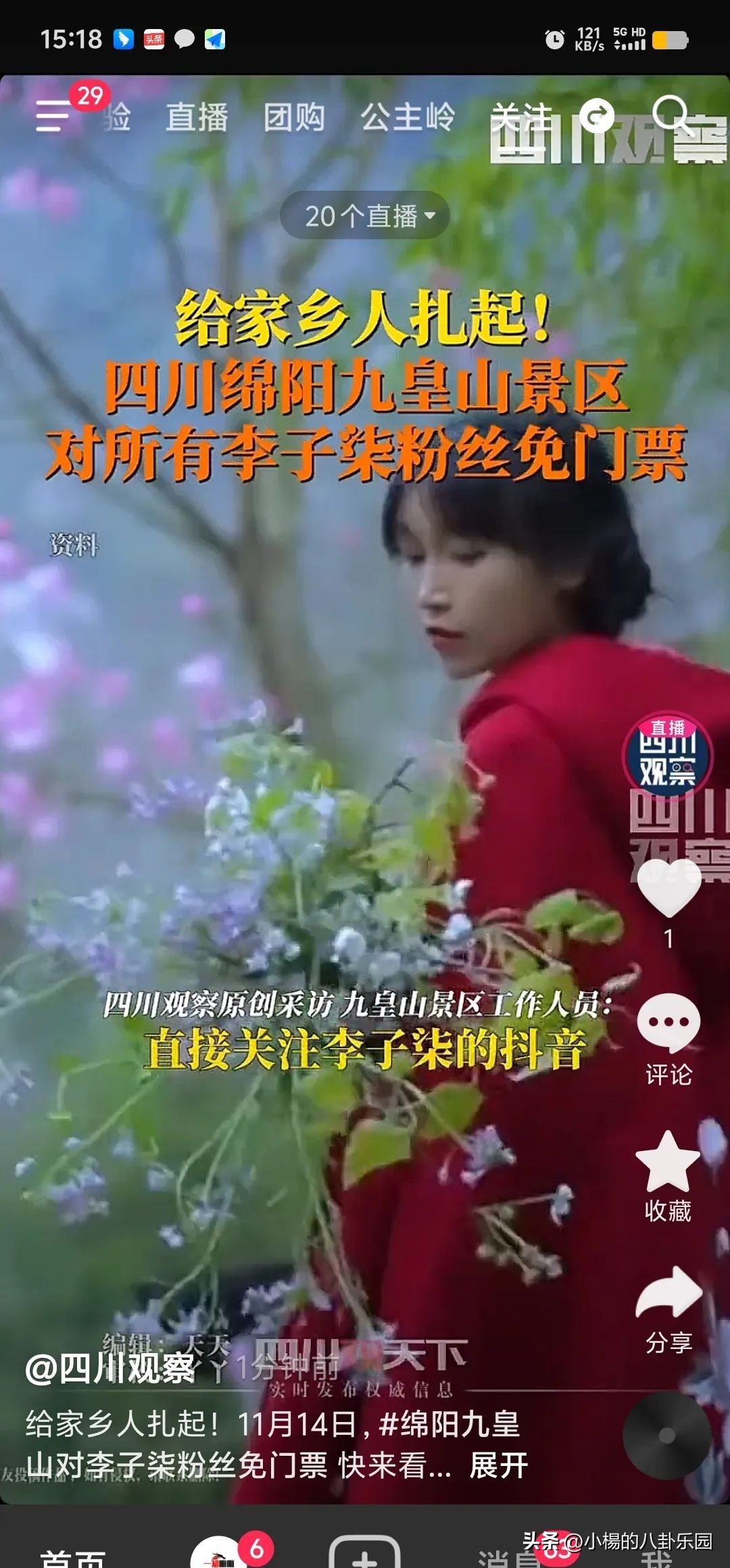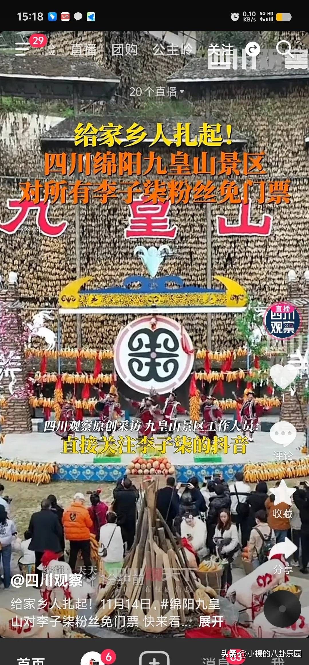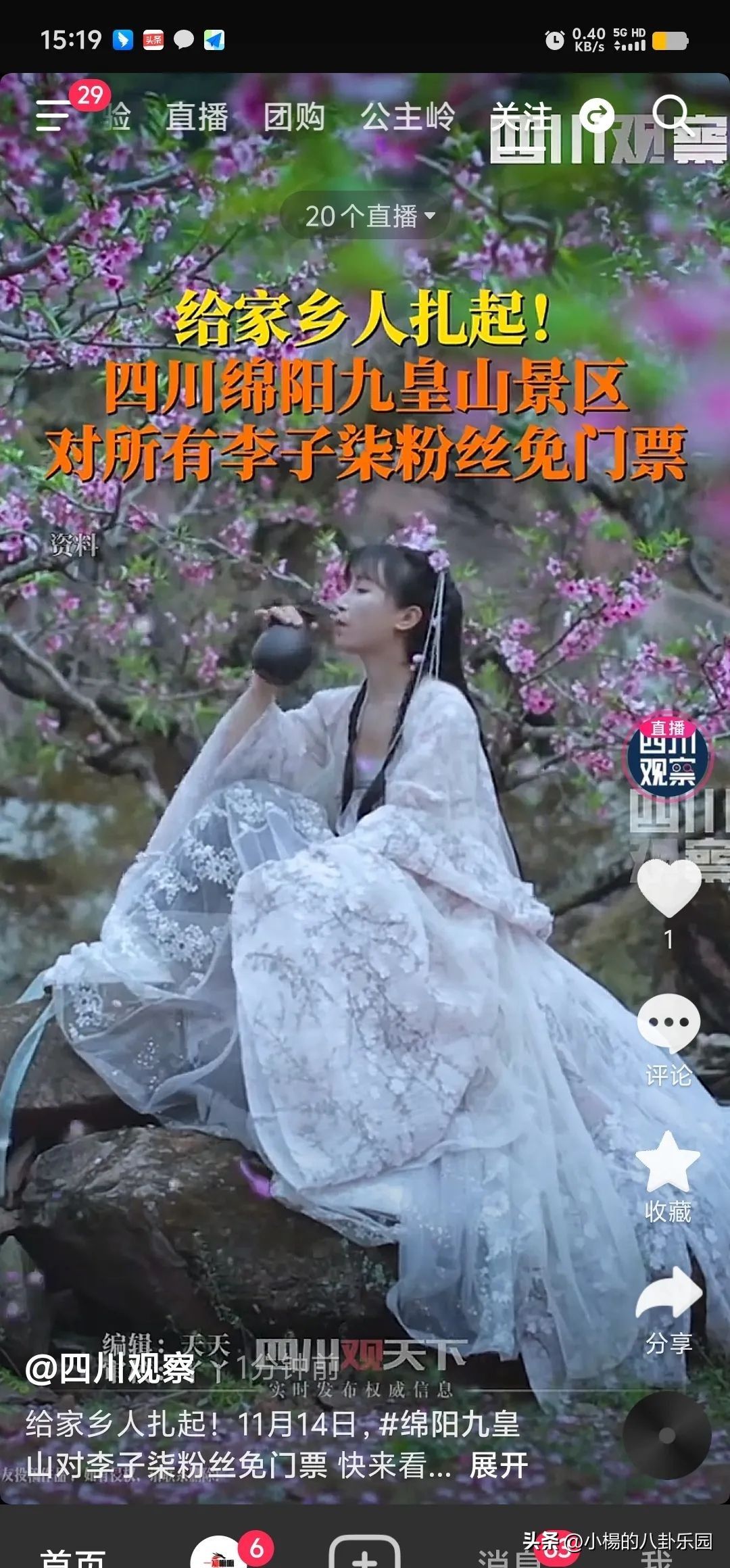 四川绵阳九黄山景区,对李子柒的粉丝免费,作为李子柒的家乡,助力李子柒回归大众视野。这个地方最近出了个大新闻,就是九黄山景区给李子柒的粉丝们开绿灯了。只要你是她的粉丝,在抖音上关注她,就能享受门票减免的福利。这事儿一出,粉丝们都激动坏了,毕竟谁不喜欢省点钱呢?