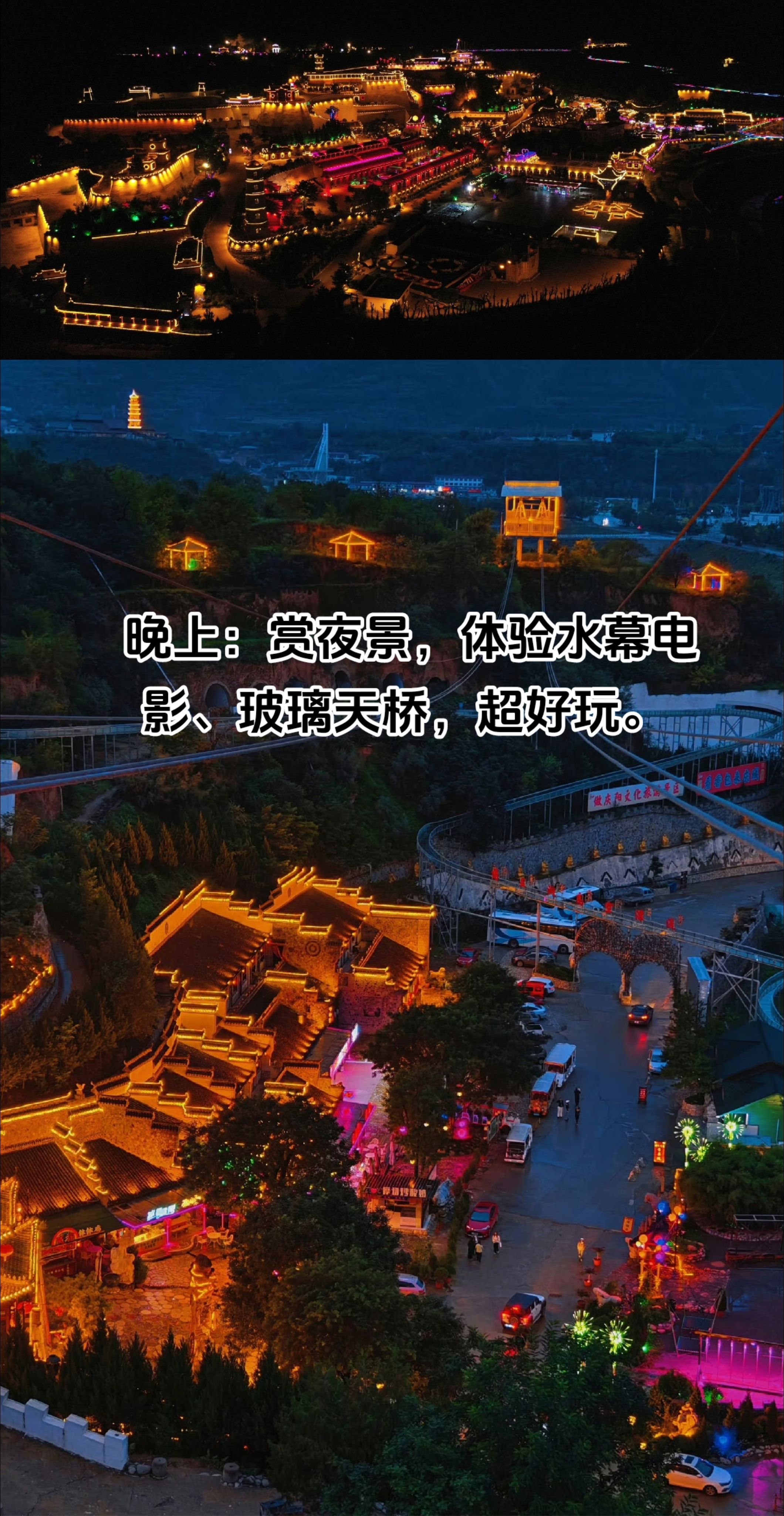 晚上:古城亮灯,美轮美奂。带孩子体验刺激的水幕电影、玻璃天桥,项目都不用排队,玩得那叫一个爽,全家人都沉浸在欢乐的氛围中。