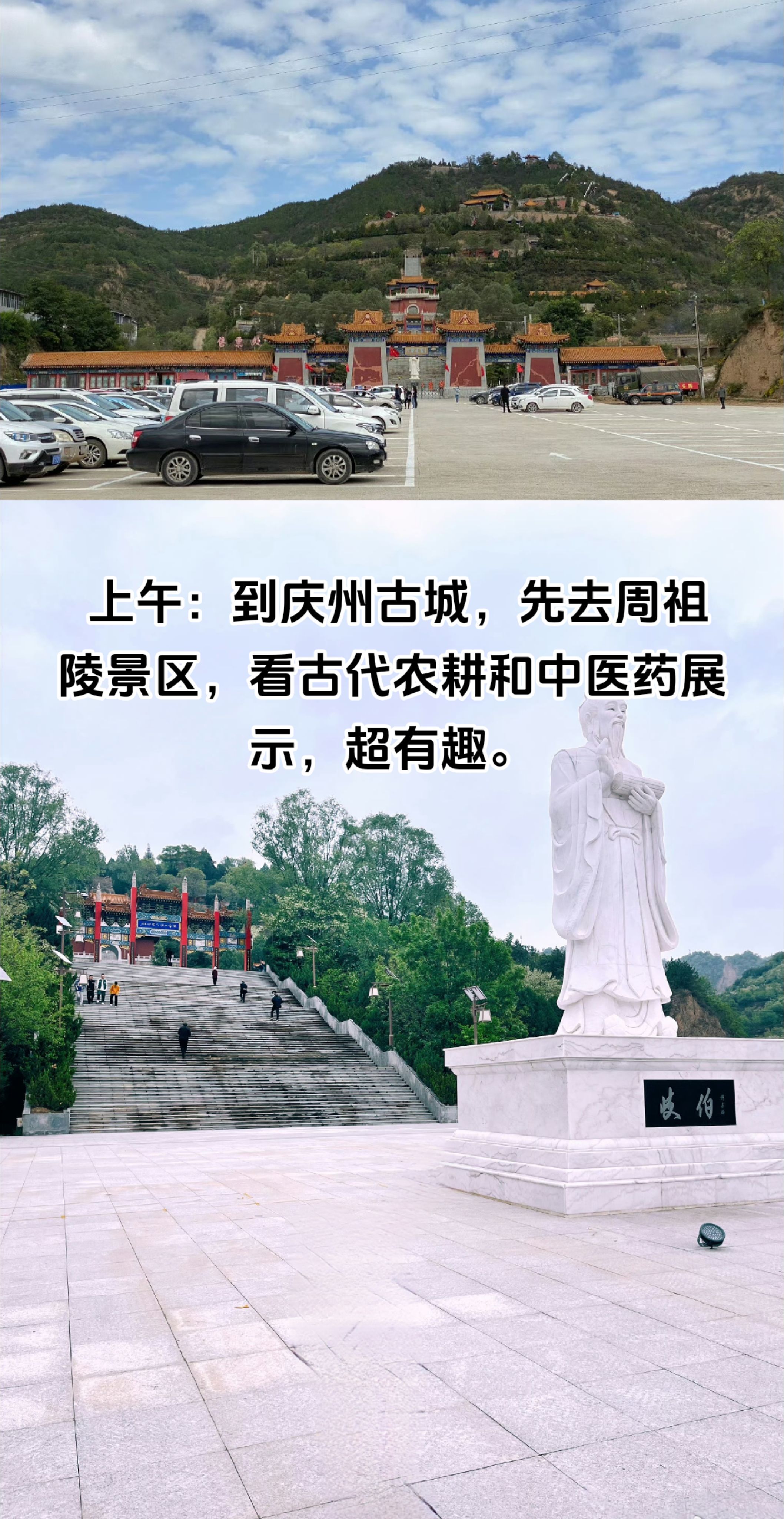 上午:抵达庆州古城,一头扎进周祖陵景区。孩子在蜿蜒的石阶上蹦蹦跳跳,尽情撒欢;爸妈慢悠悠地走着,呼吸着清新空气。在农耕文化馆,一家人一起了解古代种地的门道;中医药展示区里,认识各种神奇的药材。