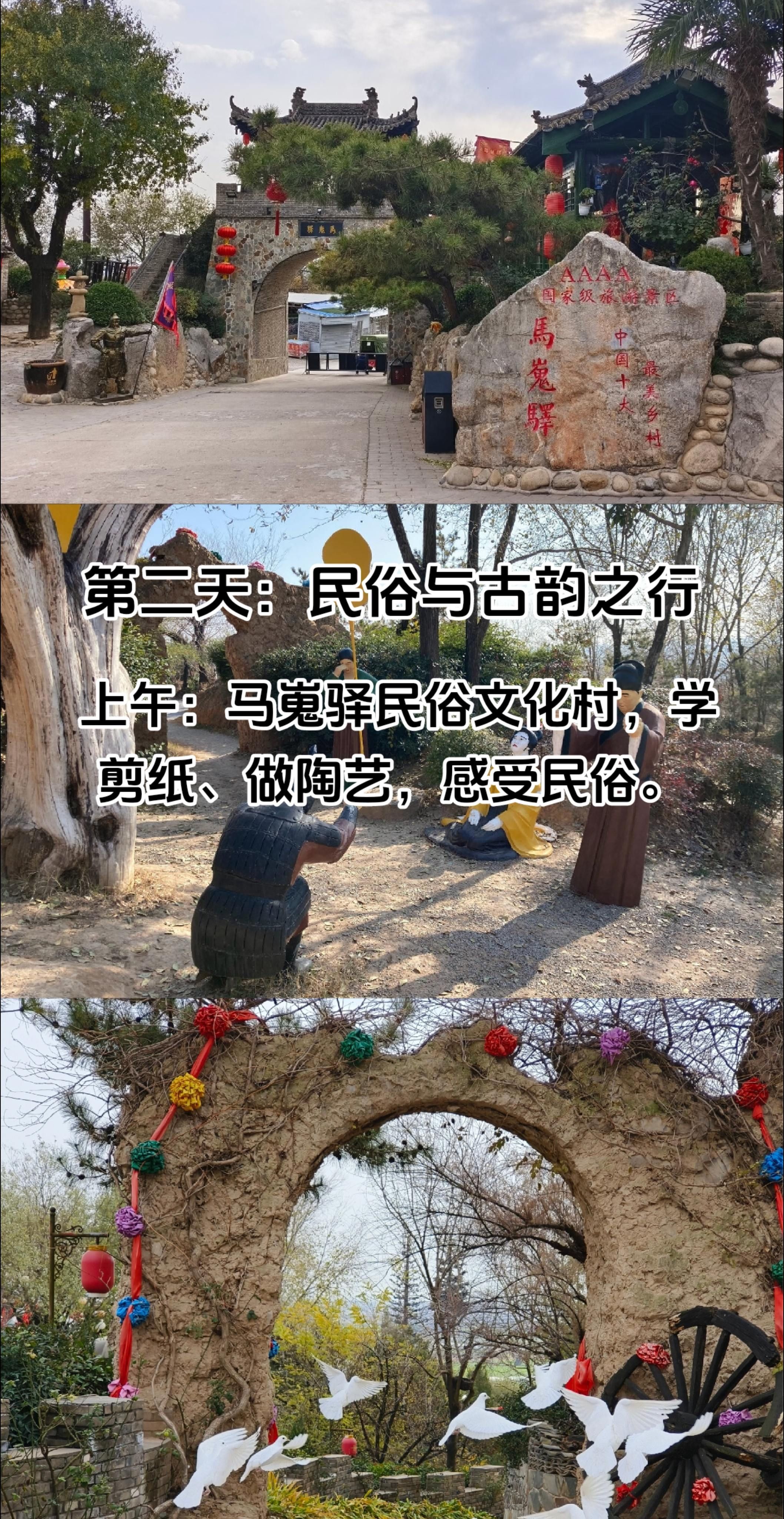 上午:前往马嵬驿民俗文化村,古色古香的建筑让人仿佛穿越。孩子跟着老师傅学剪纸、做陶艺,爸妈也能一起参与,找回童年的快乐。
