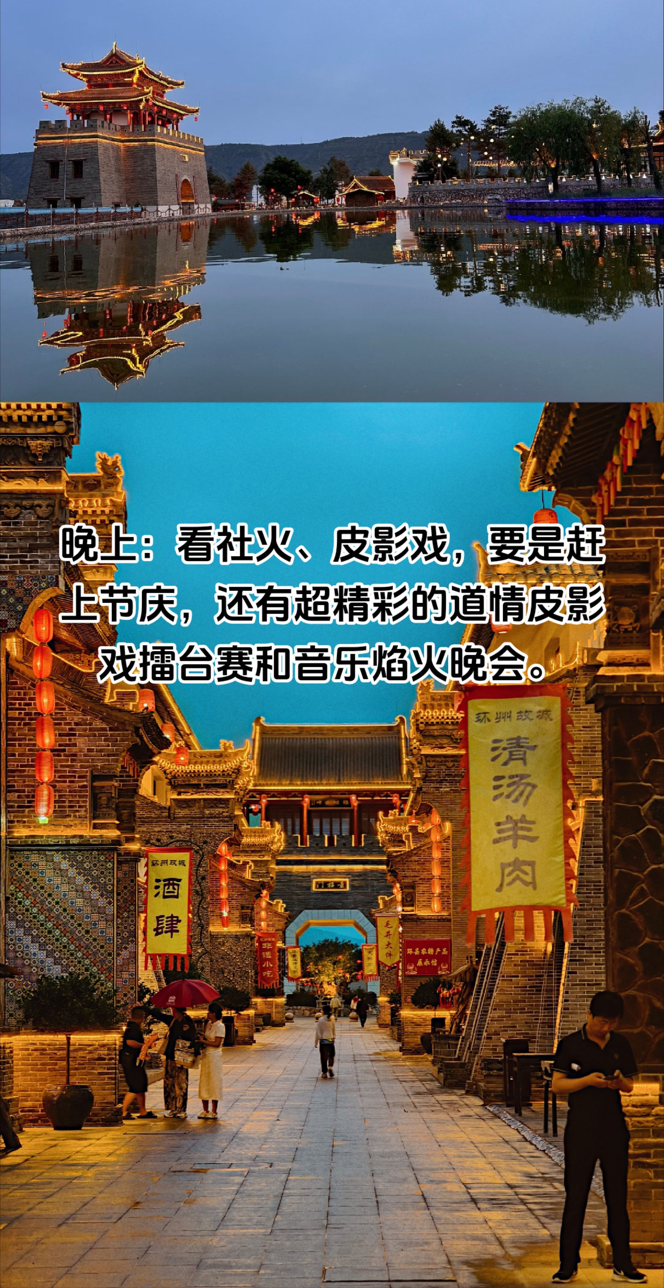 晚上:观看热闹非凡的社火、皮影戏,一家人围坐在一起,笑声不断。看完表演,伴着古城的夜景慢慢走回住处,聊聊这一天的趣事,温馨又美好。