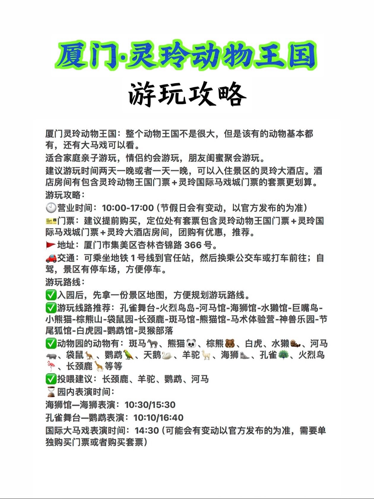 厦门灵玲动物王国游玩攻略和优惠团购来了。厦门灵玲动物王国,整个动物王国不是很大,但是该有的动物基本都有,比如大熊猫、卡皮巴拉、长颈鹿、白虎等等,还有大马戏可以看。
