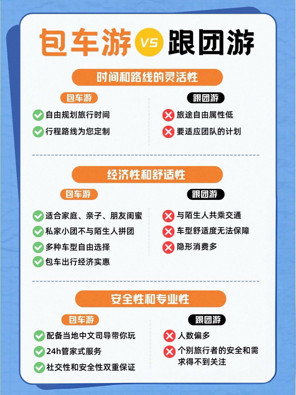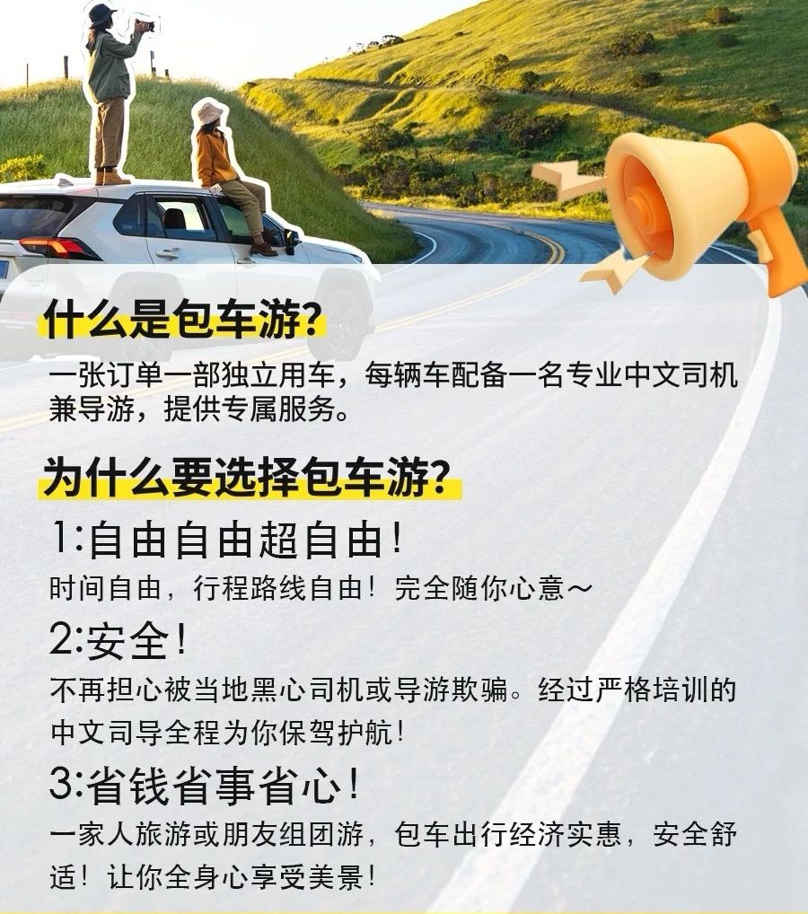 重点来咯!包车游一价全含,规定距离内随意调整不加价!油费、高速费等统统包含。无需为额外费用烦恼,自由调整时间路线,全方位省心,畅游无阻爽翻天!