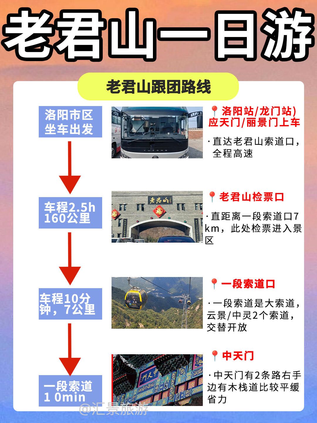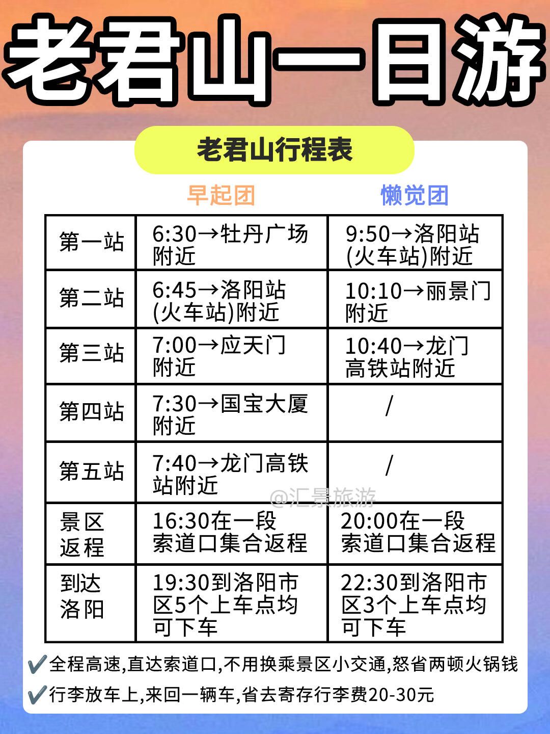 ️老君山一日游大巴车天天发,洛阳市区可接送,走高速,来回都是一辆车,行李可放车上。晚班车可以看亮灯日落