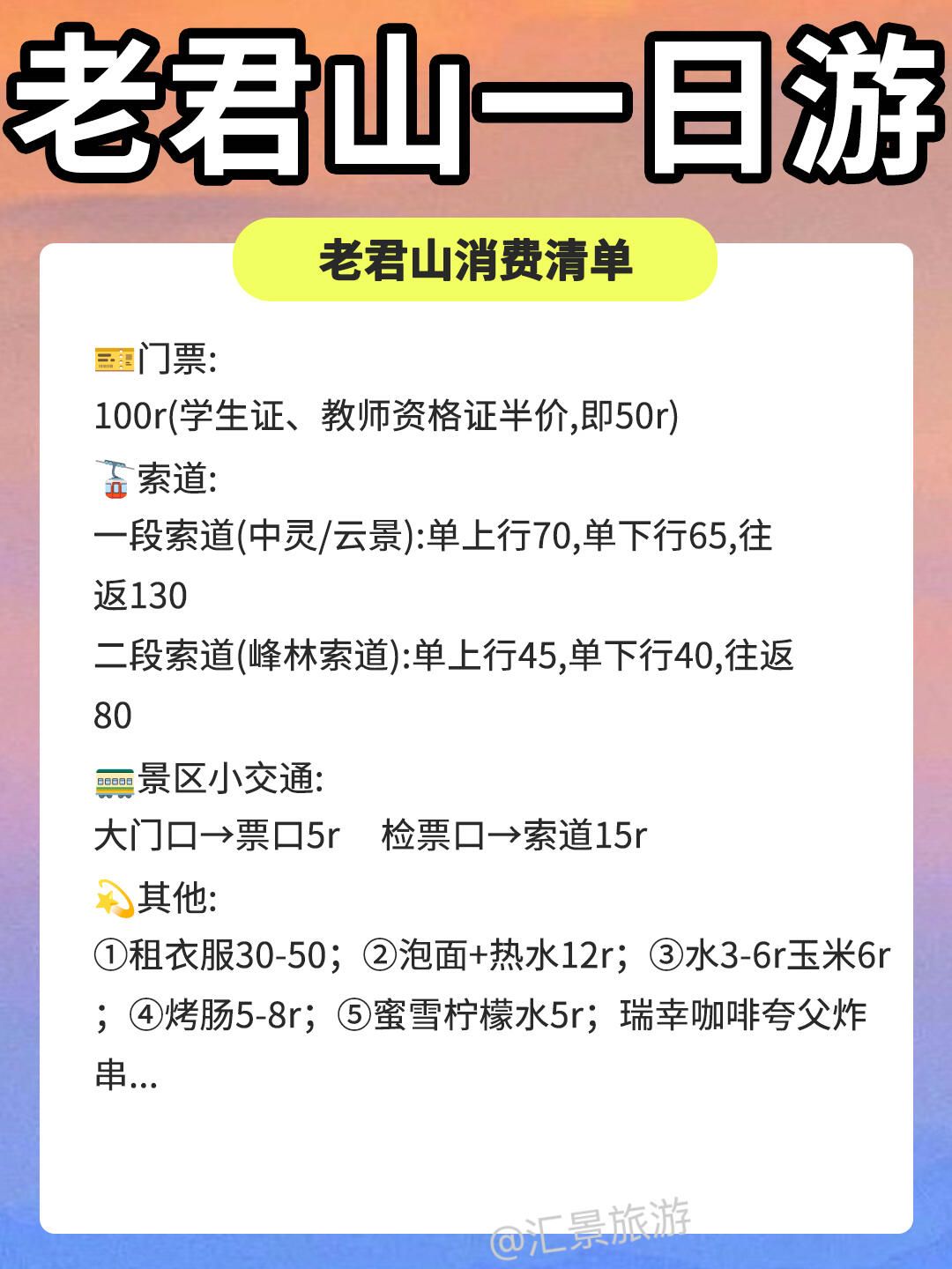 ️老君山自己去门票100,一段索道往返130,洛阳到老君山往返车100多,还只到大门口。要再花15(单程)前往爬山口。加起来300都不够