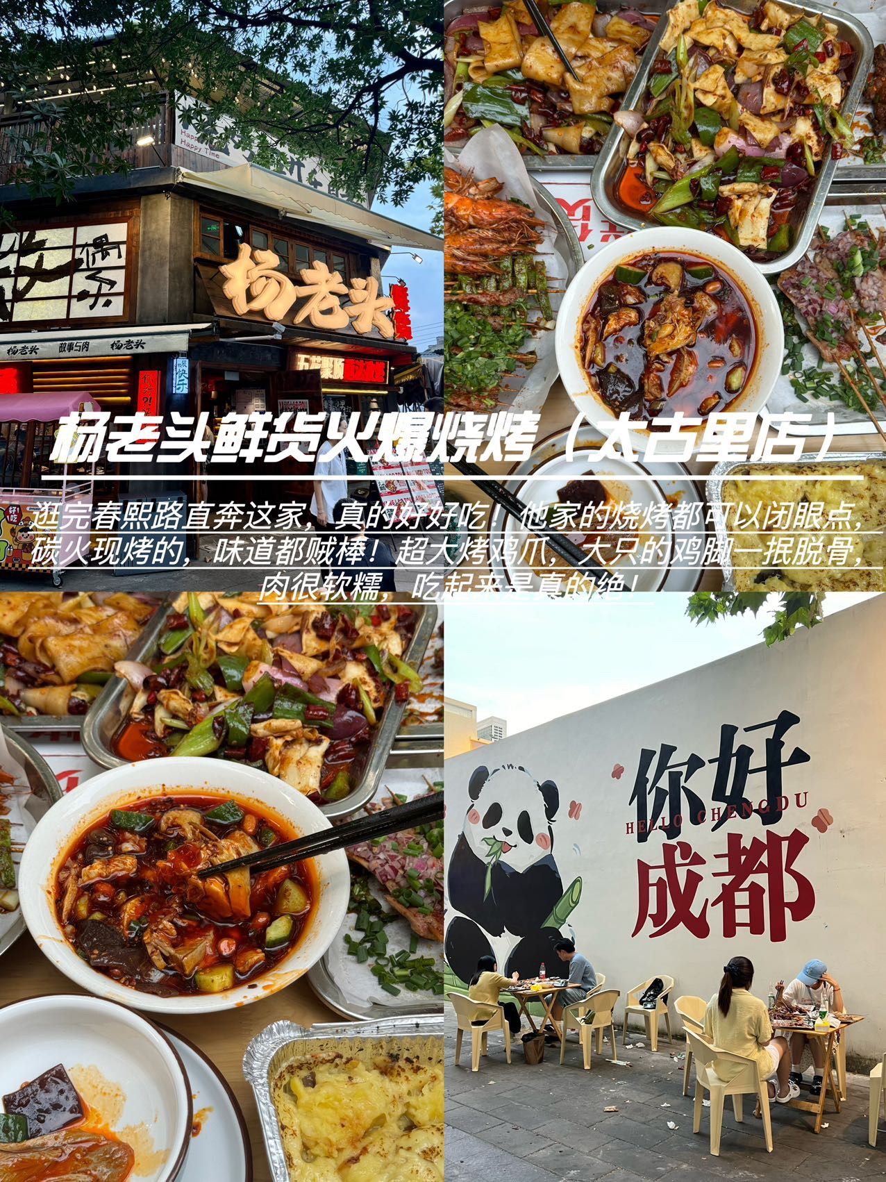 杨老头鲜货火爆烧烤(太古里店):逛完春熙路直奔这家,真的好好吃!他家的烧烤都可以闭眼点,碳火现烤的,味道都贼棒!超大烤鸡爪,大只的鸡脚一抿脱骨,肉很软糯,吃起来是真的绝!